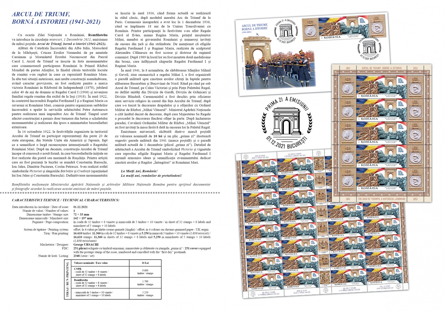 The anniversary postage stamps issue, consisting of a postage stamp with a face value of Lei 10 and a First Day Cover suggestively illustrates the military parade of 1941 (postage stamp) and a current military parade of December 1st (First Day Cover). The architectural detail of the Arch of Triumph symbolizing Victory and the vignettes that reproduce the effigies of Queen Maria and King Ferdinand I harmoniously summarize the idea and significance of the event dedicated to the honouring of the heroes and the “Unifier” Kings of Greater Romania.