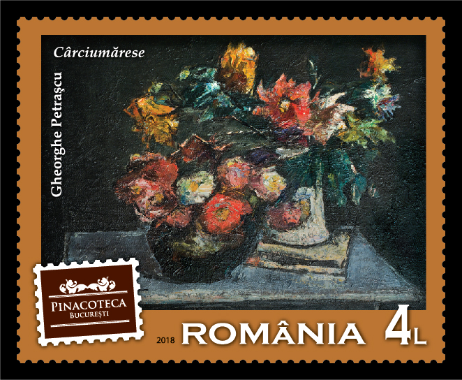 Zinnia (Carciumarese) painting, whose author is Gheorghe Petrascu, is illustrated on the stamp with the face value of Lei 4.00.