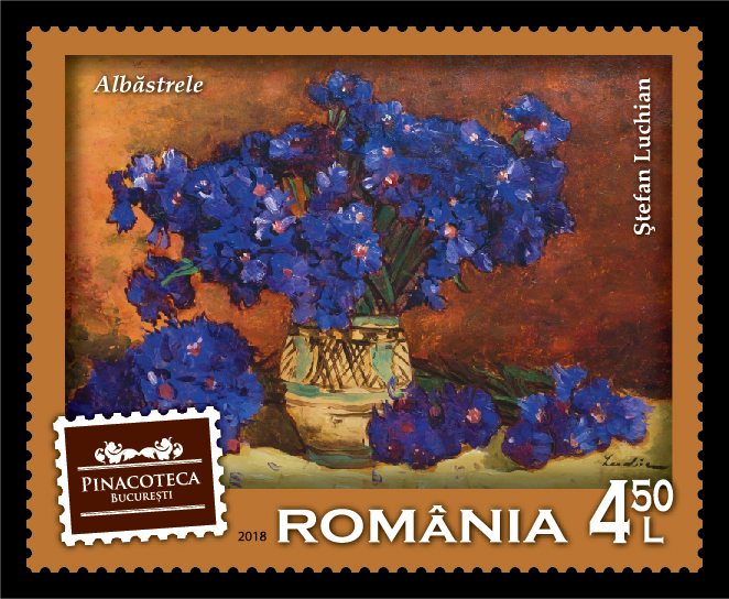 Another valuable artwork from the Pinacotheque’s patrimony, Cornflowers (Albastrele) signed by Stefan Luchian, is shown on the stamp with the face value of Lei 4.50.