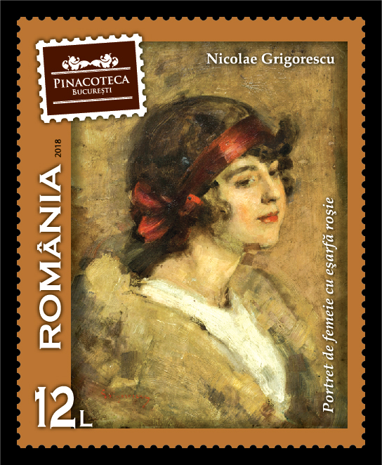 The painting bearing the name Woman Portrait with Red Scar (Portret de femeie cu esarfa rosie), signed by Nicolae Grigorescu, is reproduced on the stamp with the face value of Lei 12.00.