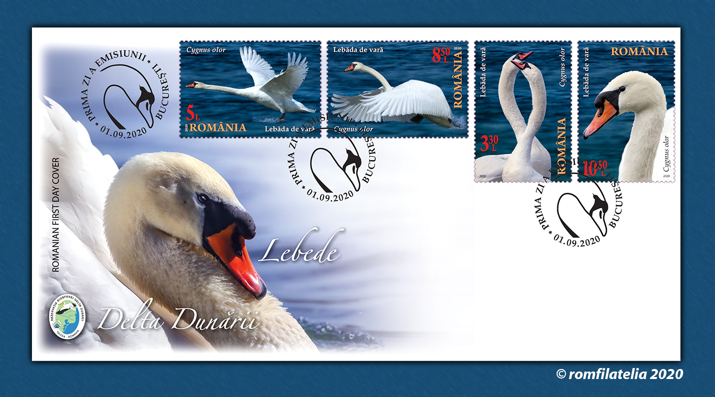 The postage stamps issue “The Danube Delta. Swans” will be available on Tuesday, September 1st 2020, in Romfilatelia’s shops network in Bucharest, Bacau, Brasov, Cluj-Napoca, Iasi and Timisoara and online on https://romfilatelia.ro/store/. The postage stamps issue is completed by the First Day Cover, in sheet of 32 stamps, minisheet of 4 stamps with illustrated border and block of 4 imperforated stamps.