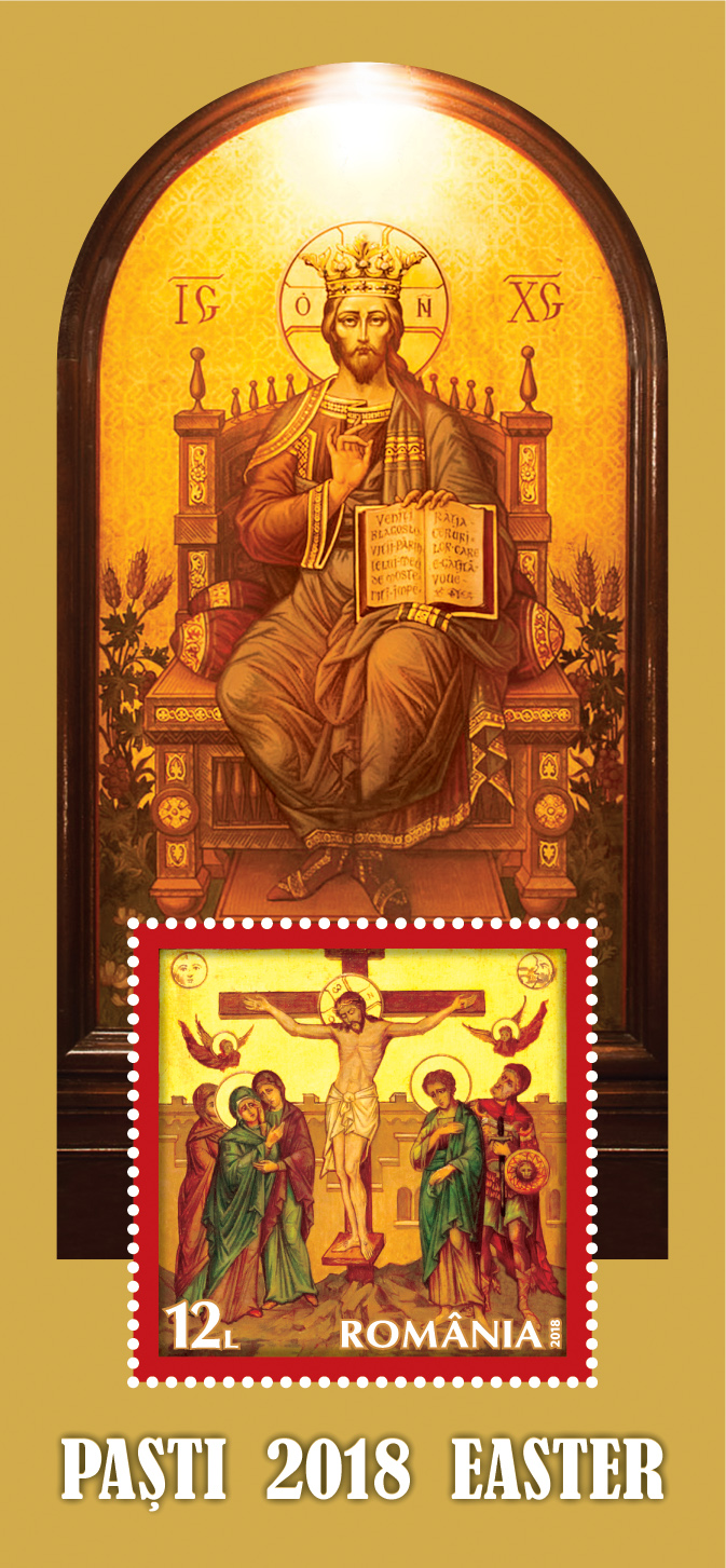 The stamp of the perforated souvenir sheet, with the face value of Lei 12, reproduces the icon The Crucifixion of Lord Jesus Christ, from the iconostasis of the Alba Iulia Cathedral. Through the crucifixion, the most important moment from Jesus Christ’s messianic mission, God’s Son receives the earthly death, the supreme sacrifice, through which He takes upon himself the sins of the world, reconciling man and Creator. The Icon of the Crucifixion signifies God’s infinite kindness and love towards humanity, and He is not afraid of any suffering.