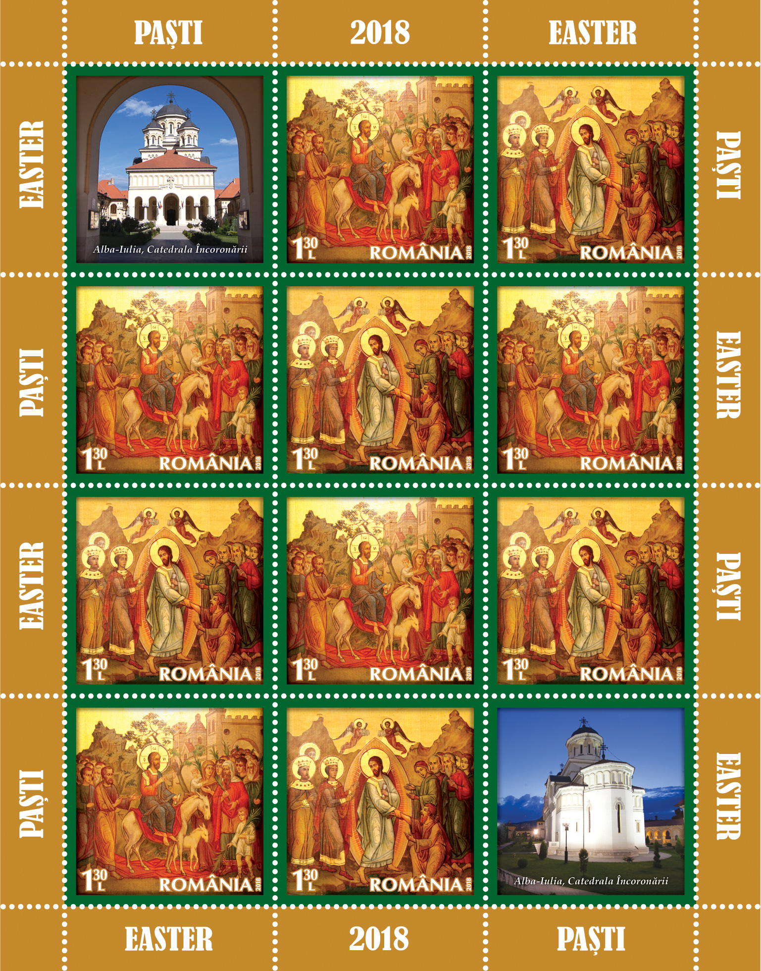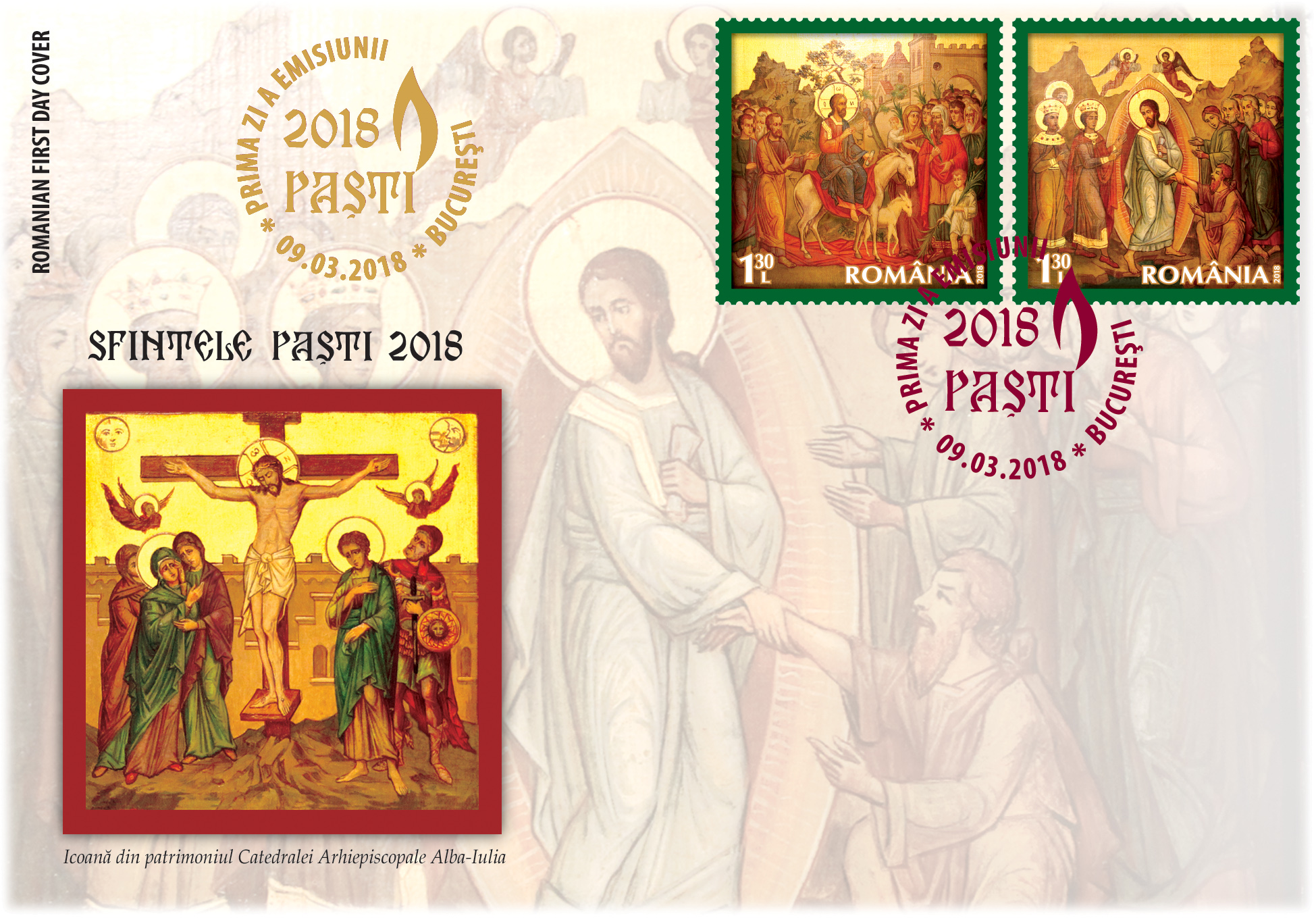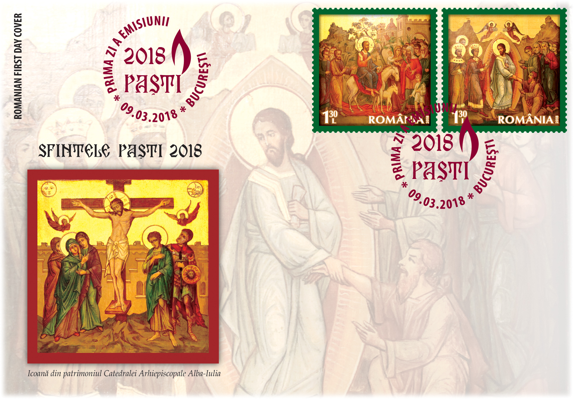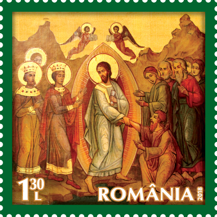 The two postage stamps of the issue, both with the face value of Lei 1.30, illustrate icons from the patrimony of the Alba Iulia Cathedral – The Entrance to Jerusalem and The Resurrection of Jesus Christ.