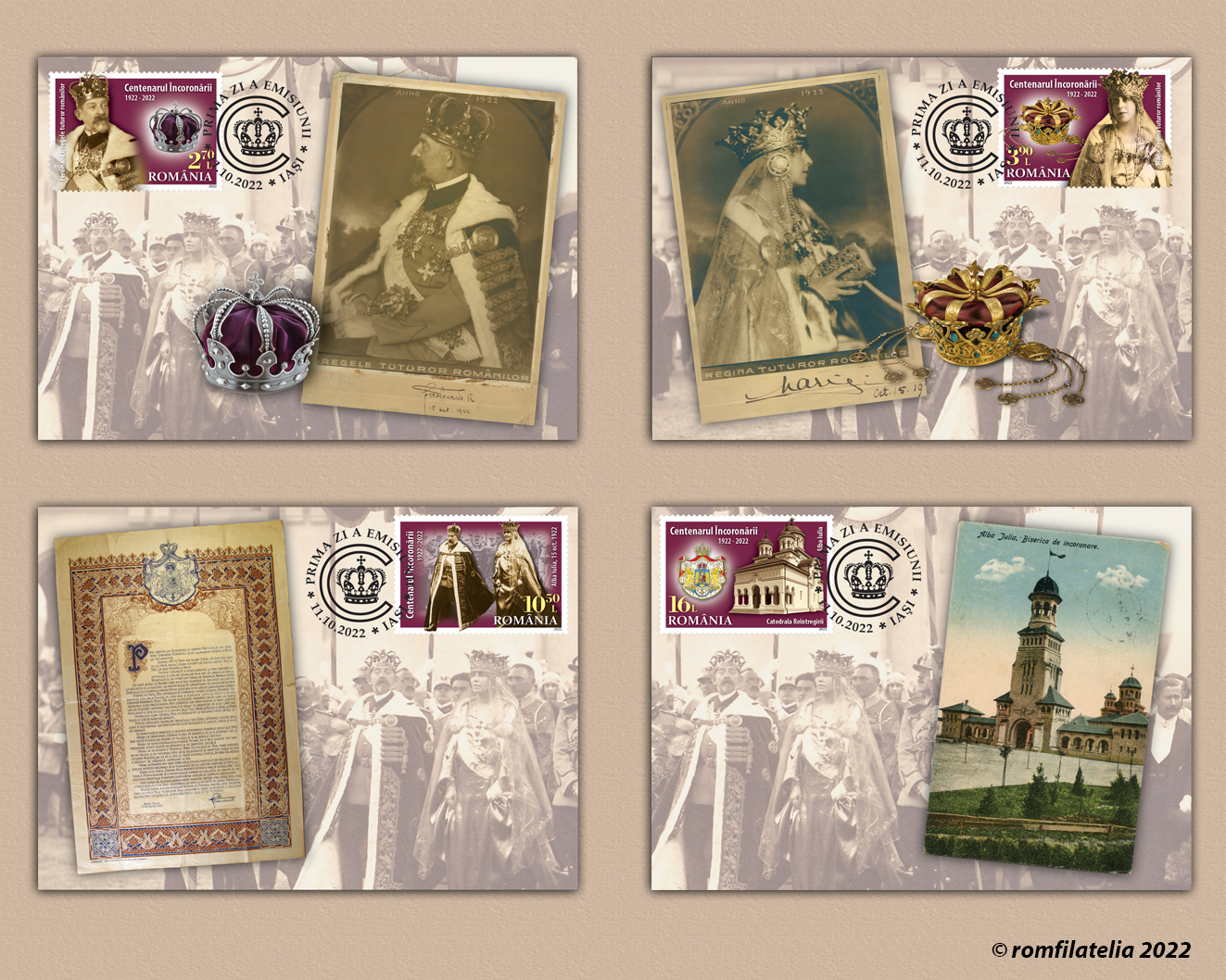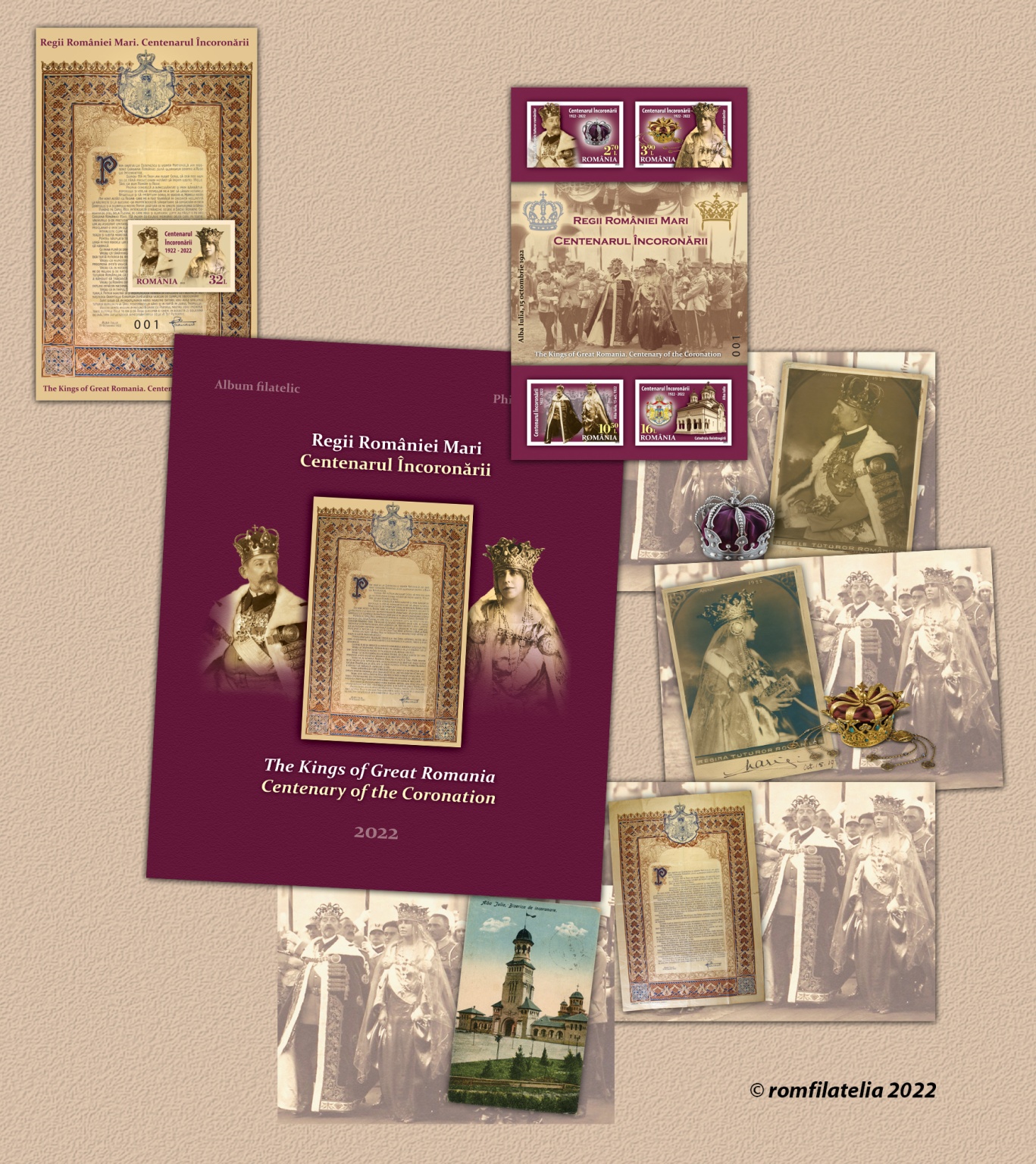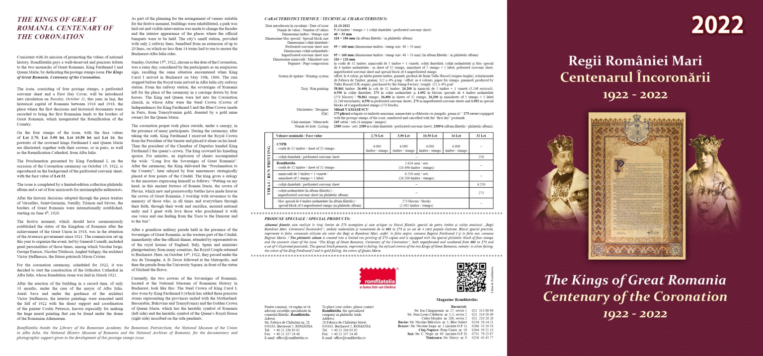 Romfilatelia continues its mission of promoting the values of national history and introduces into circulation the anniversary philatelic issue of The Kings of Great Romania. Centenary of the Coronation, a reference moment in the history of Romania.