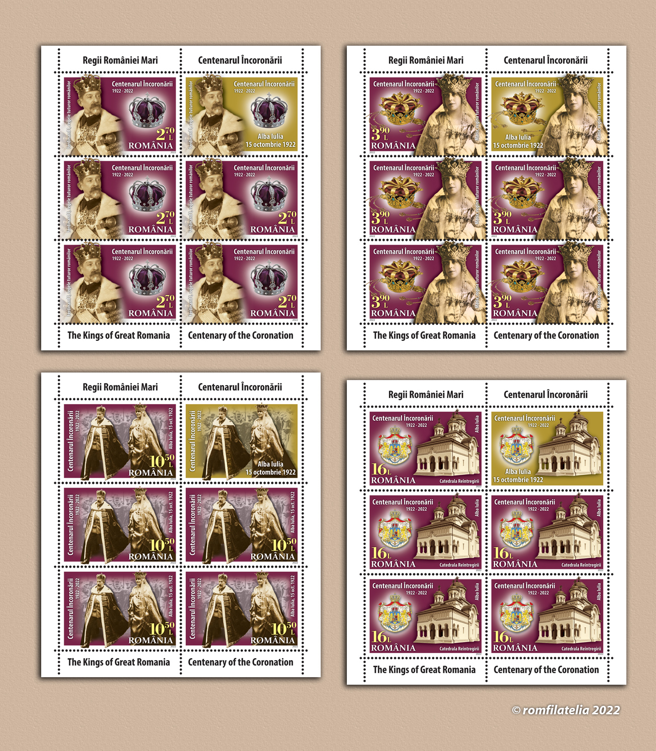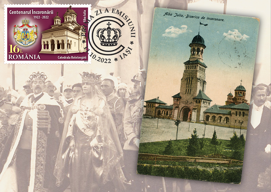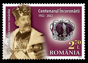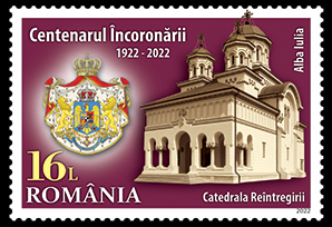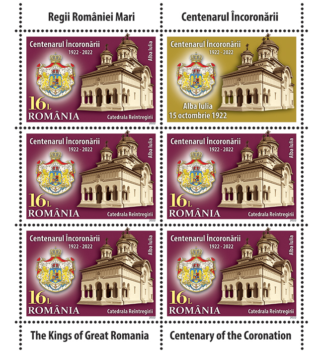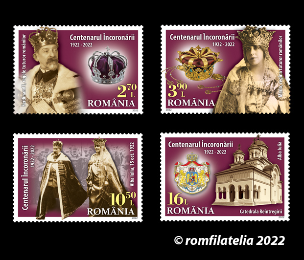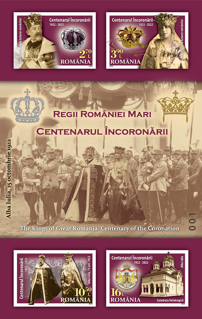 The portraits of King Ferdinand I and Queen Marie, emblematic figures of the Romanian nation, are illustrated on the stamps of the issue, with the face values of Lei 2.70, Lei 3.90 lei, Lei 10.50 lei and Lei 16, together with their crowns, as well as the Reunification Cathedral, from Alba Iulia.