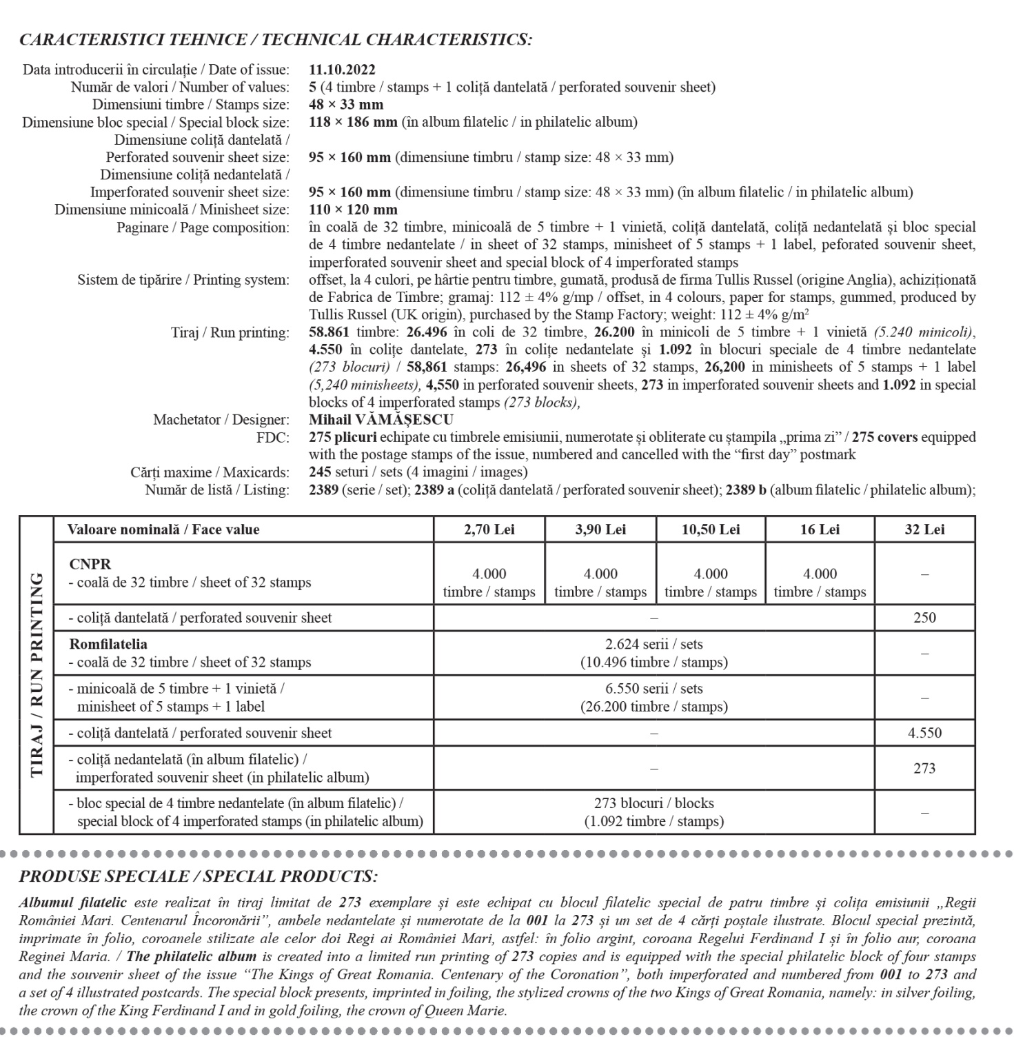 The philatelic issue will be available starting Tuesday, 11 of October, in Romfilatelia’s shops network in Bucharest, Bacau, Brasov, Cluj-Napoca, Iasi and Timisoara and online on https://romfilatelia.ro/store/.