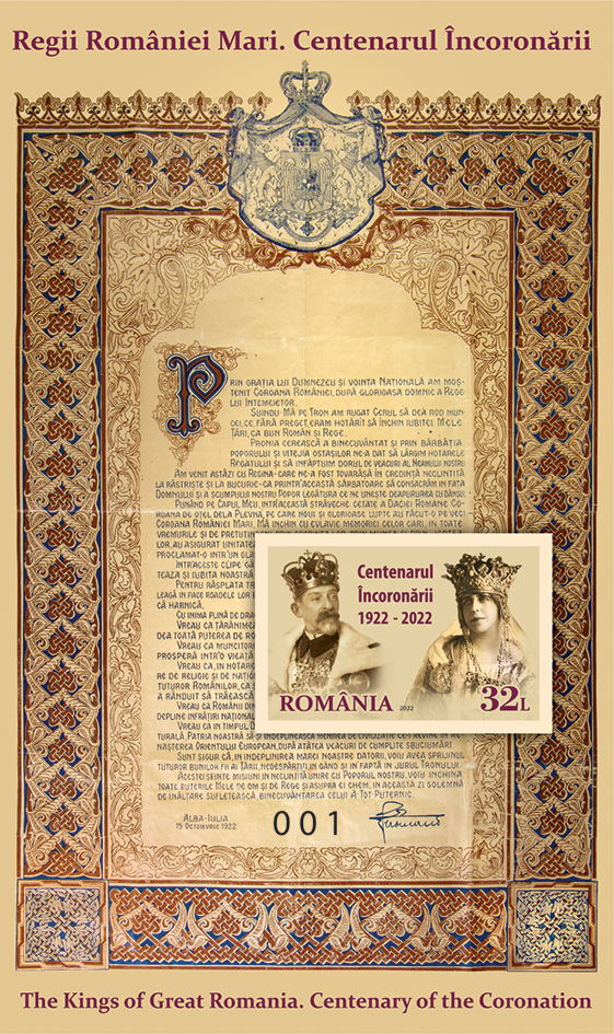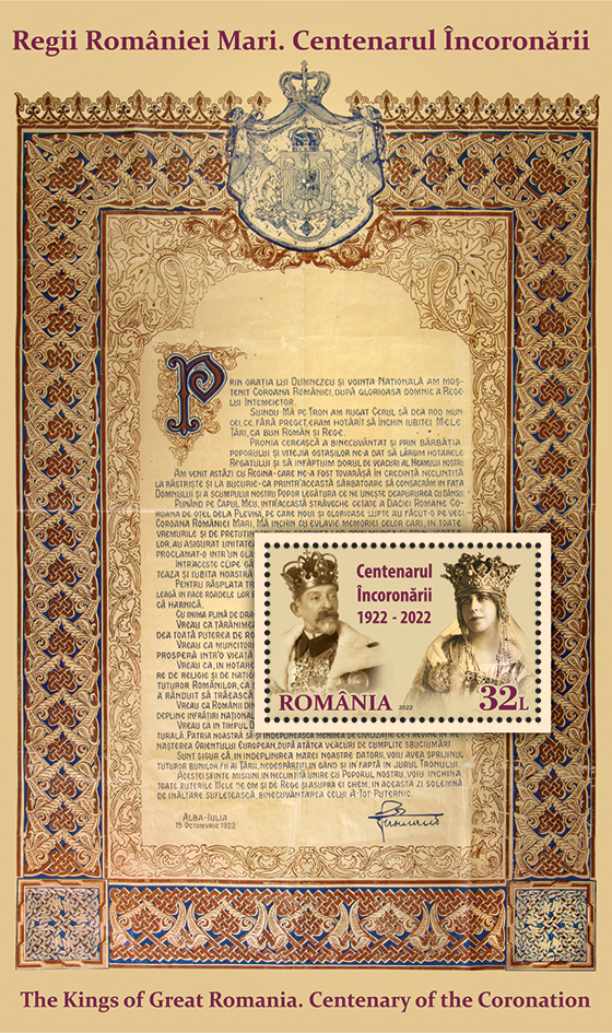 The Proclamation presented by King Ferdinand I, on the occasion of the Coronation ceremony on October 15, 1922, is reproduced on the background of the perforated souvenir sheet, with the face value of Lei 32.