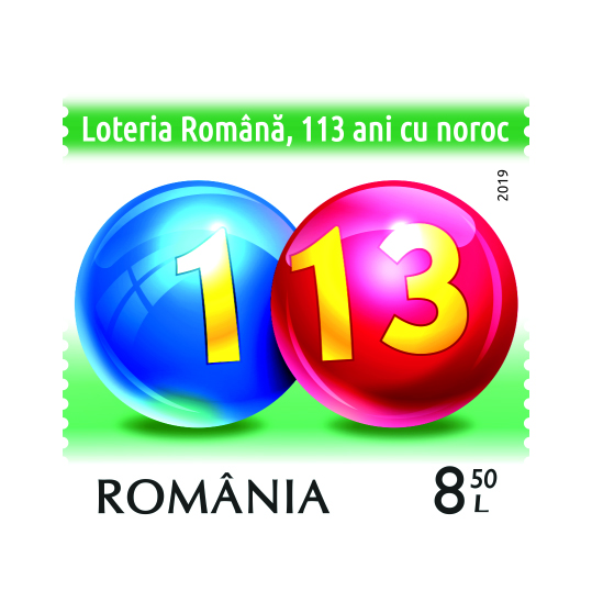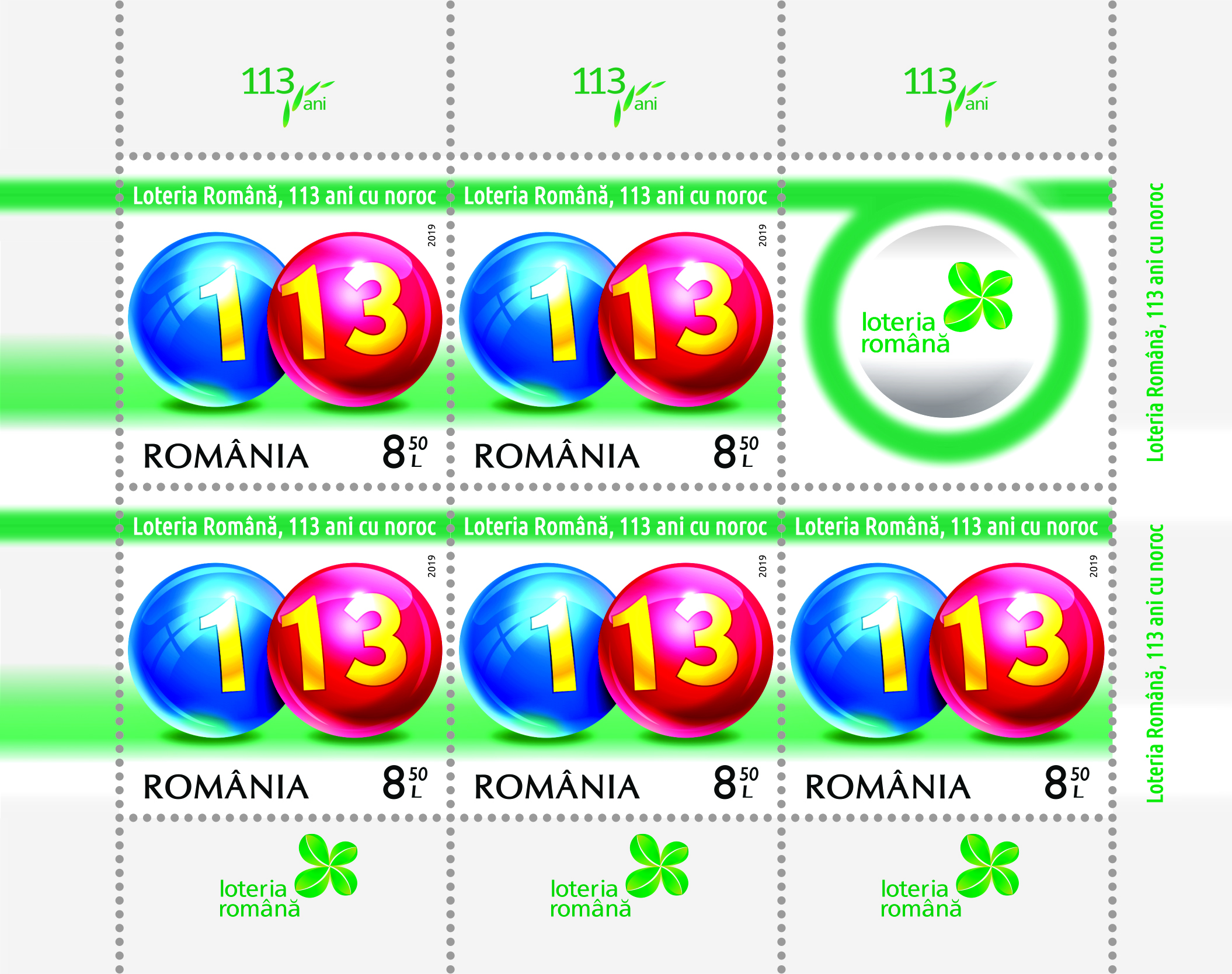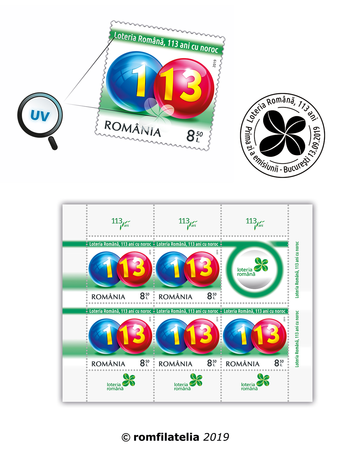 The postage stamp with the face value of Lei 8.50, reproduces in its symbolic graphics two balls used in drawing winning numbers on which the digits 1 and 13 appear, meant to represent the “age” of 113 years of the Romanian Lottery. Visible only under UV light, the text “The Romanian Lottery, 113 years of luck” can be found along the image of a clover, a symbol found in the logo of the celebrated institution.