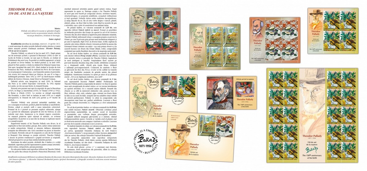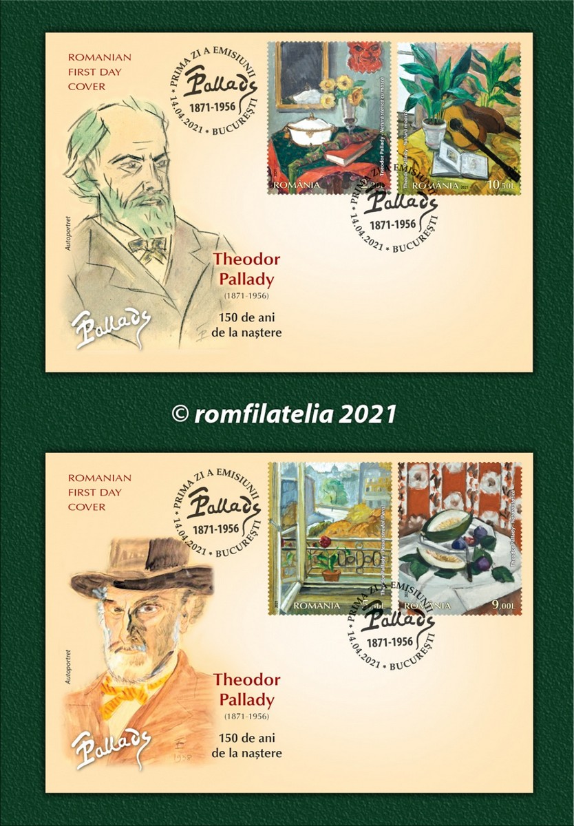 The postage stamps issue “Theodor Pallady, the 150th anniversary of his birth ” will be available on Wednesday, April 14th 2021, in Romfilatelia’s shops network in Bucharest, Bacau, Brasov, Cluj-Napoca, Iasi and Timisoara and online on https://romfilatelia.ro/store/.