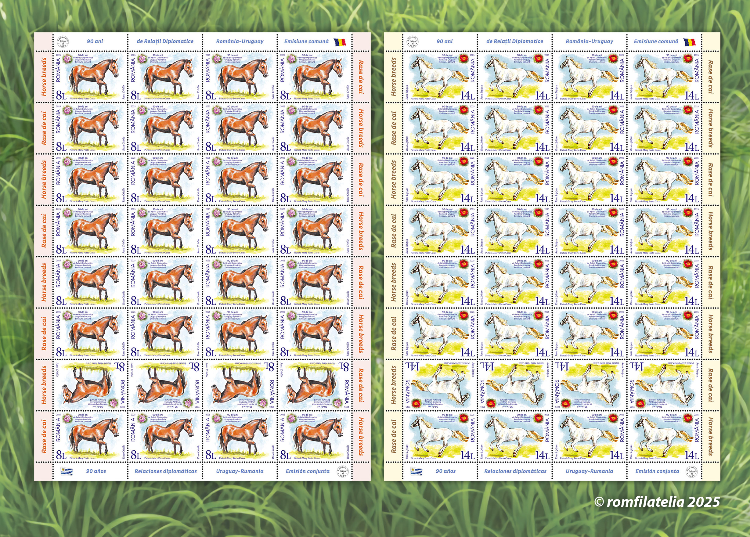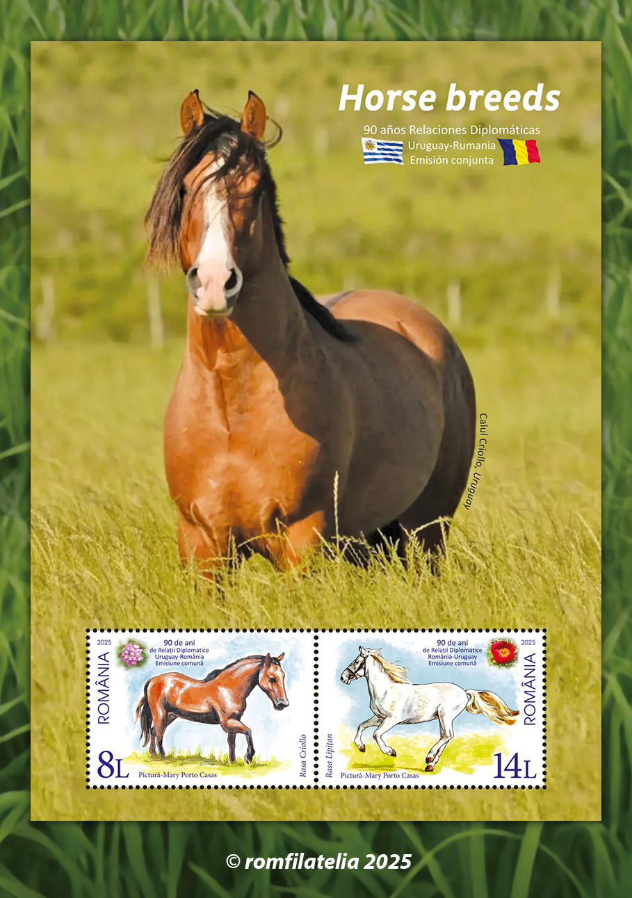 Romfilatelia și Poșta Română introduc în circulație vineri, 5 decembrie a.c. emisiunea filatelică comună România-Uruguay, având ca subiect tematic de colecție: RASE DE CAI. Emisiunea menită să marcheze aniversarea a 90 de ani de relații diplomatice, are în componența sa două mărci poștale, un bloc de două mărci poștale dantelate, un plic „prima zi” și o mapă filatelică având un produs special de colecție, în tiraj limitat.