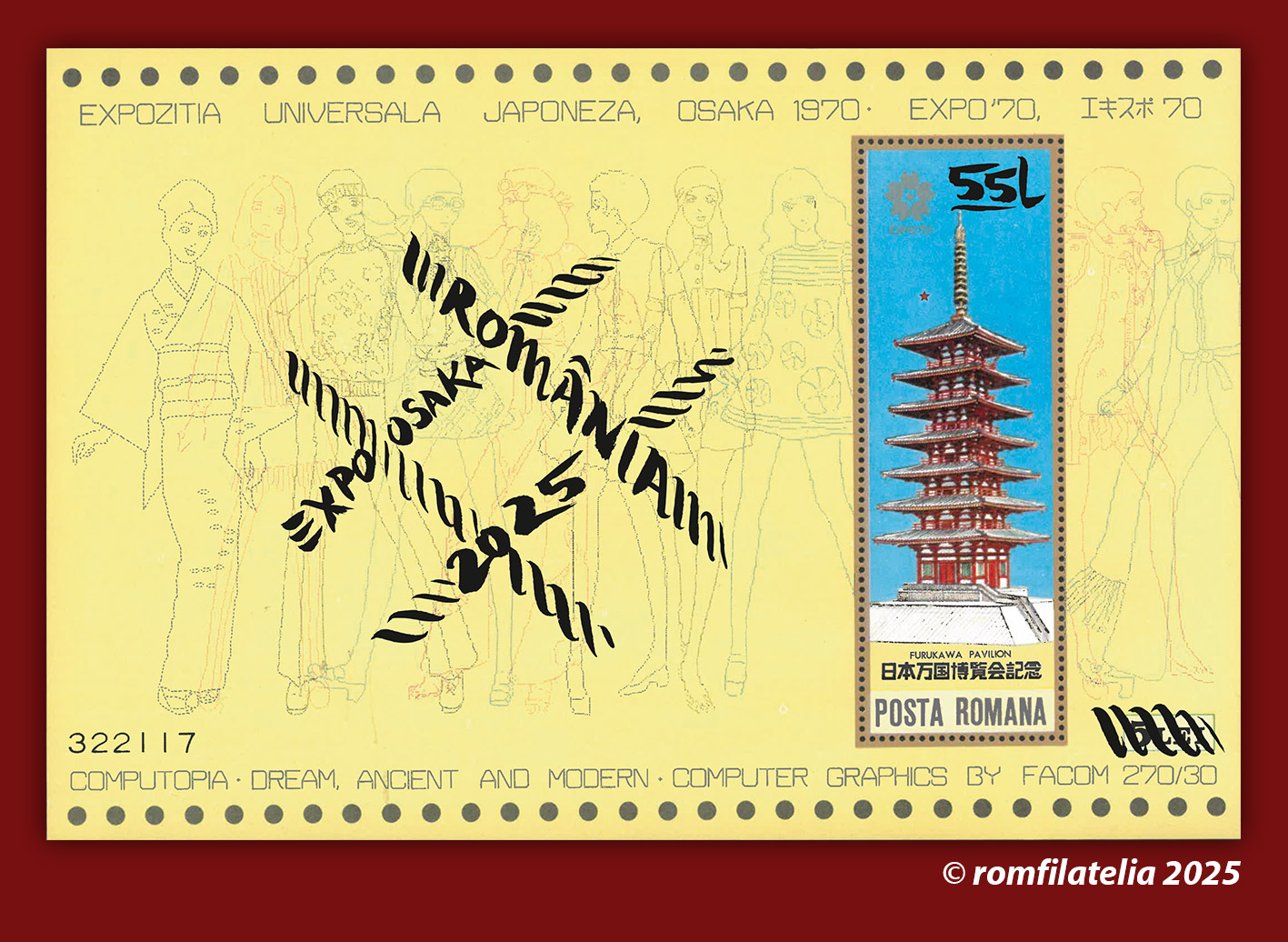 Romfilatelia și Poșta Română introduc în circulație luni, 15 septembrie a.c., emisiunea filatelică „EXPO OSAKA 1970 – 2025”, conținând o coliță filatelică și un plic „prima zi”, pentru a marca un eveniment de importanță expozițională mondială și o aniversare din cronologia filateliei românești: 55 de ani de la prima emisiune tematică EXPO’70 OSAKA din 1970. Emisiunea filatelică compusă din două mărci poștale și o coliță filatelică dantelată a fost pusă în circulație la 24 martie 1970 (mărcile poștale) și 1 decembrie 1970 (coliță filatelică dantelată).