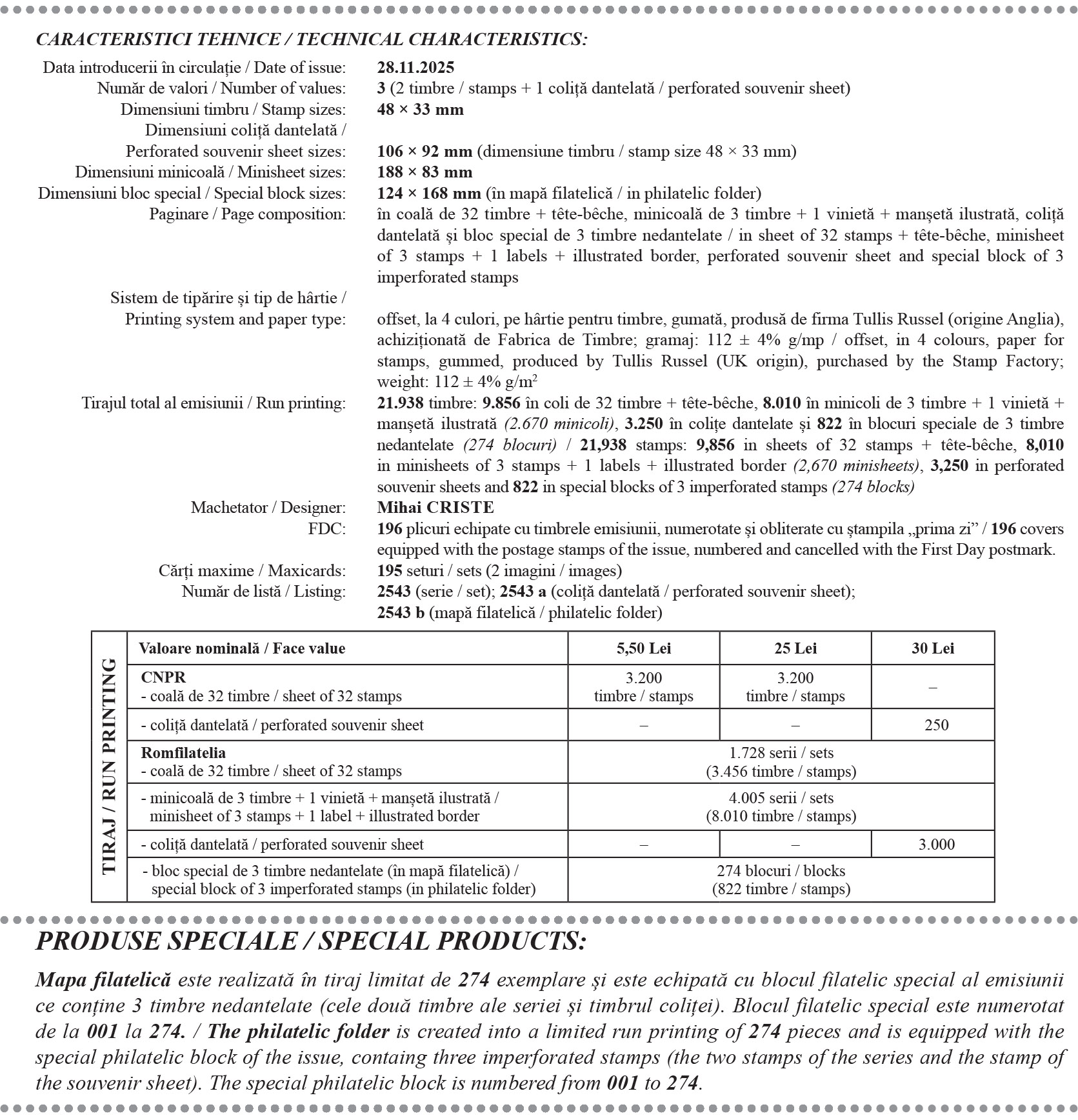 Emisiunea are în componența sa două mărci poștale, o coliță dantelată, un plic „prima zi”, două cărți maxime pentru pasionații de maximafilie și o mapă filatelică având un produs special de colecție, în tiraj limitat.