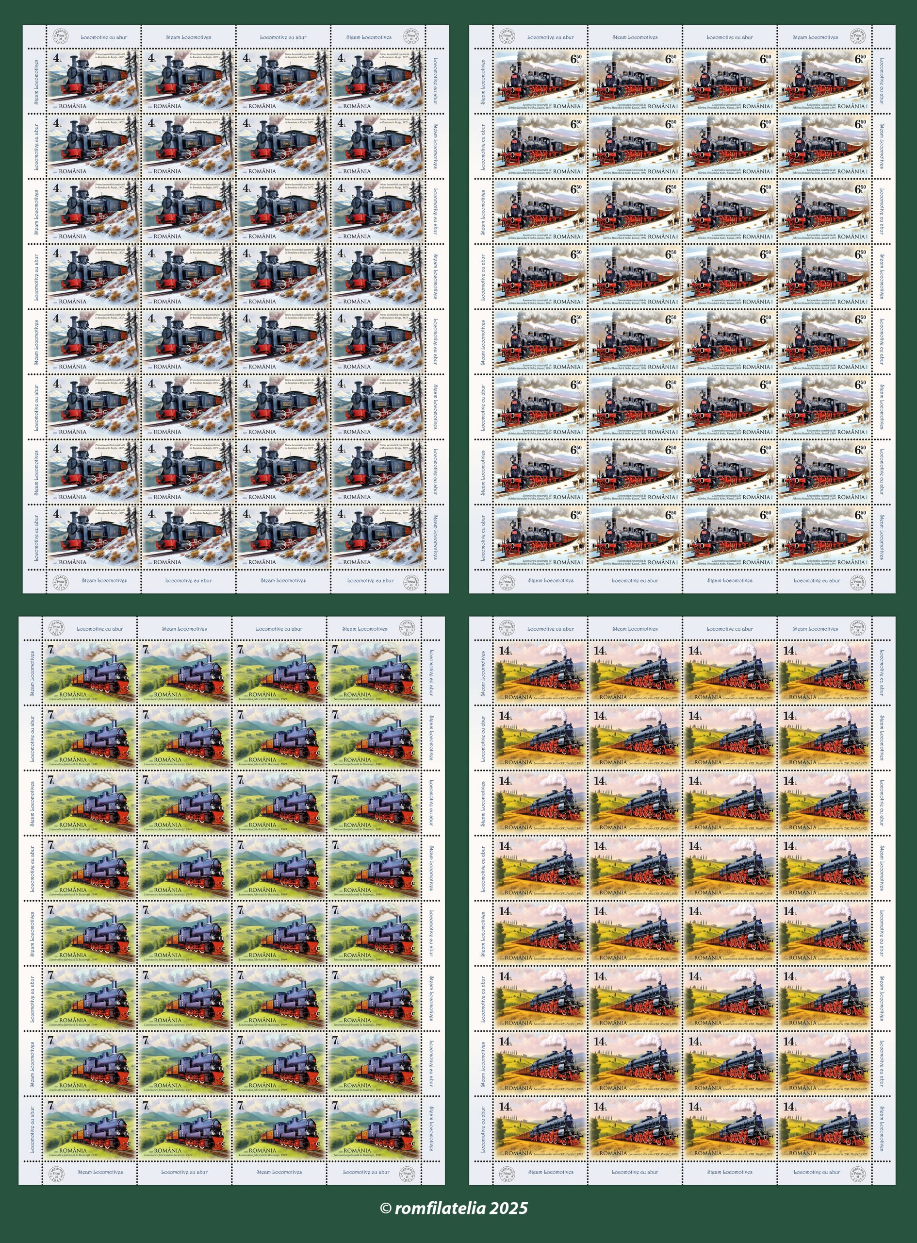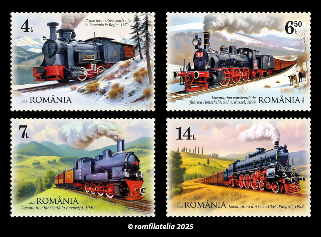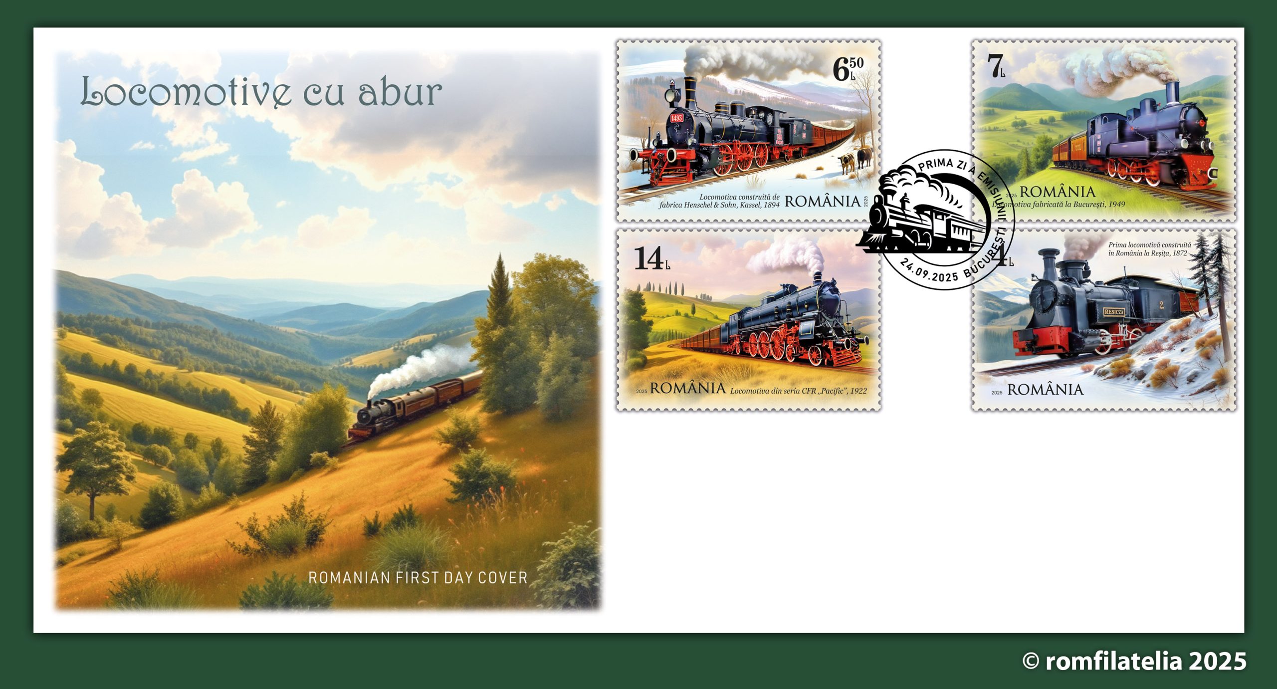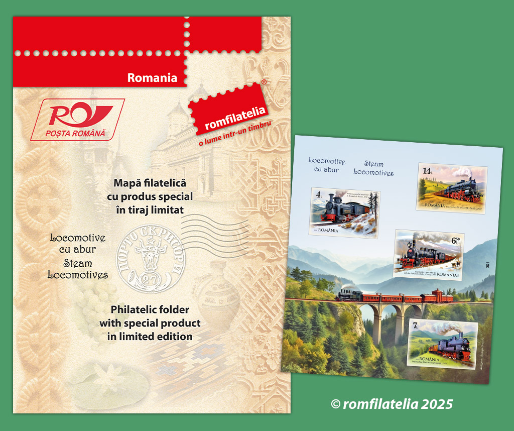 Romfilatelia și Poșta Română introduc în circulație miercuri, 24 septembrie a.c. o emisiune cu o tematică de colecție Locomotive cu abur compusă din patru mărci poștale, un plic „prima zi”, 4 cărți maxime pentru pasionații de maximafilie și o mapă filatelică cu produs special în tiraj limitat.
