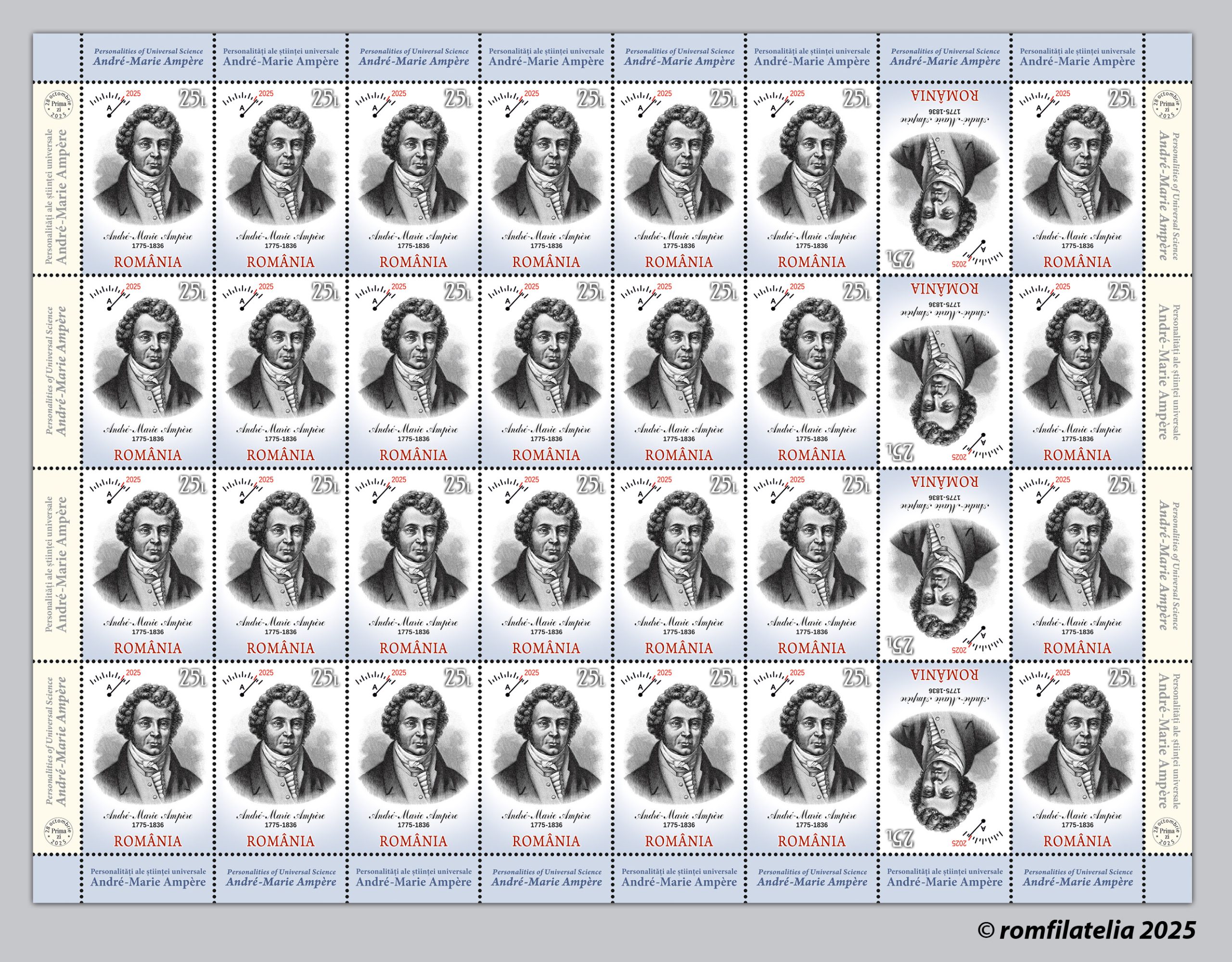 Romfilatelia și Poșta Română introduc în circulație marți, 28 octombrie a.c., o emisiune aniversară dedicată unui mare savant francez sub titlul generic Personalități ale științei universale. André-Marie Ampère, compusă din o marcă poștală și un plic „prima zi”.