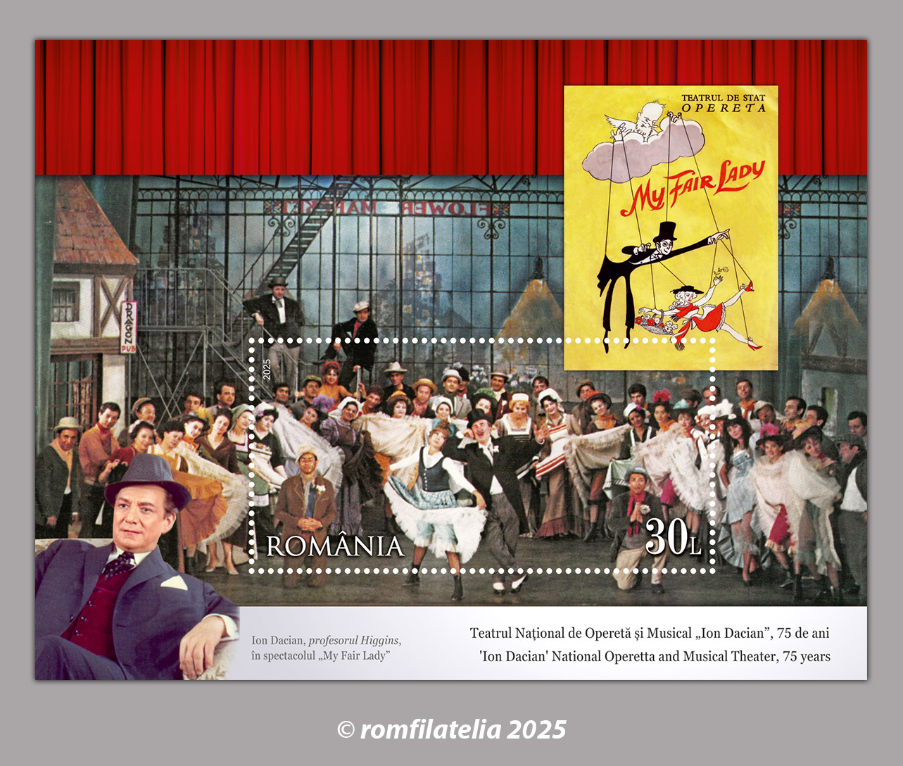 Colița filatelică dantelată prezintă în conturul perforat al mărcii poștale cu valoarea nominală de 30 lei, ansamblul actorilor interpreți din opereta My Fair Lady și un portret reprezentativ al lui Ion Dacian, interpret al personajului profesorului Higgins.