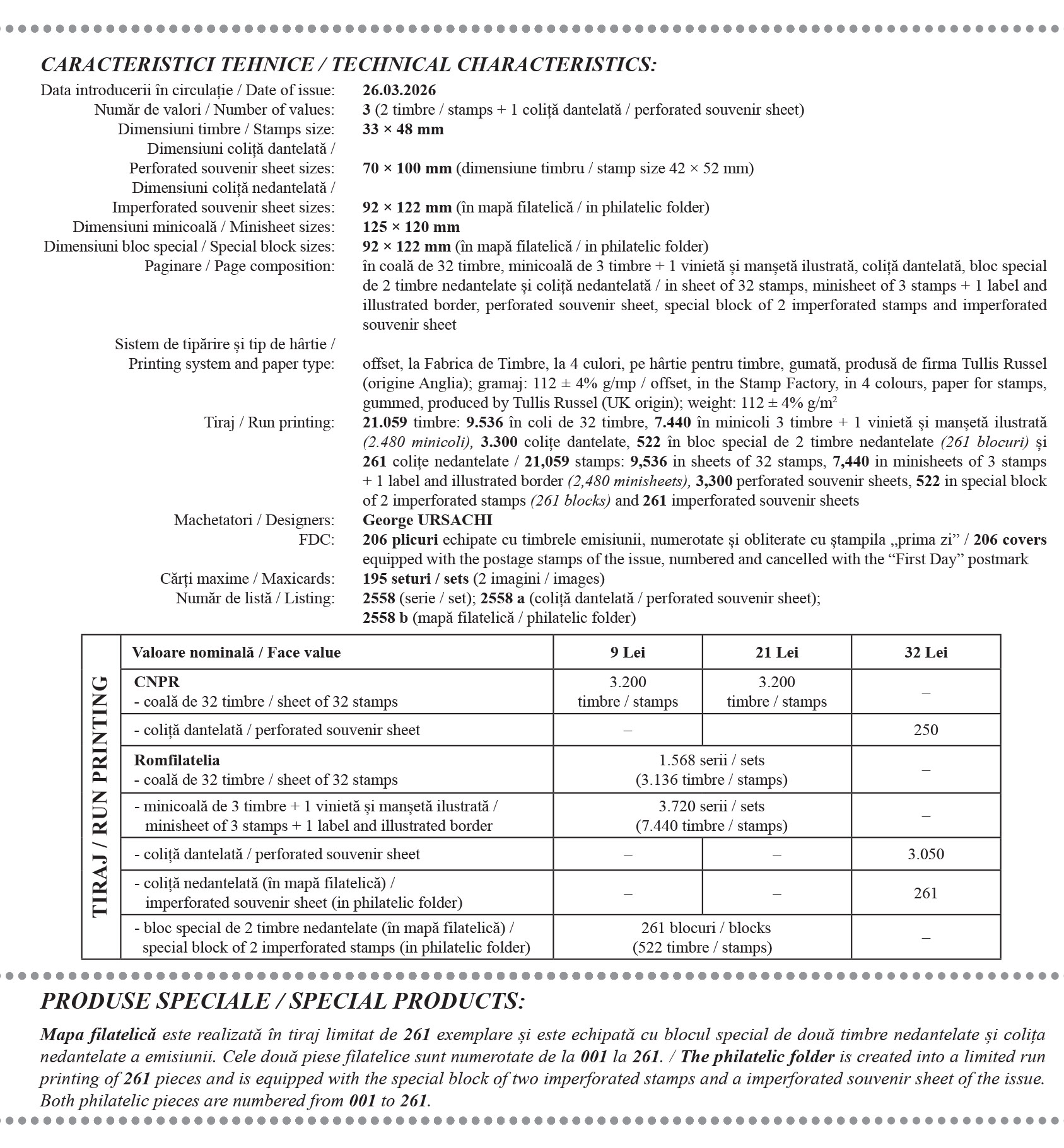 În componența emisiunii se regăsesc două mărci poștale, o coliță dantelată, un plic „prima zi”, un set de două cărți poștale maxime pentru pasionații de maximafilie și o mapă filatelică cu produse speciale în tiraj limitat.