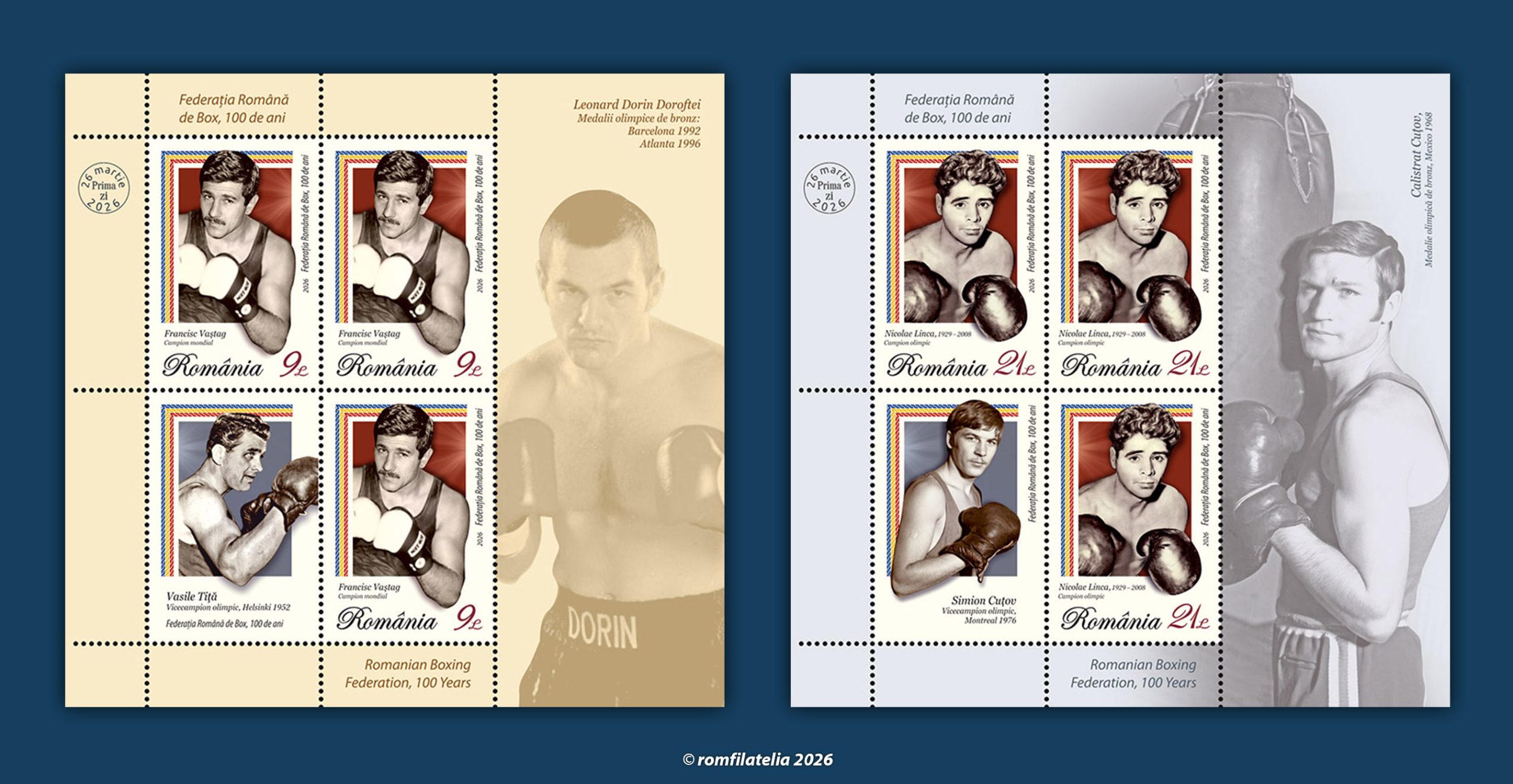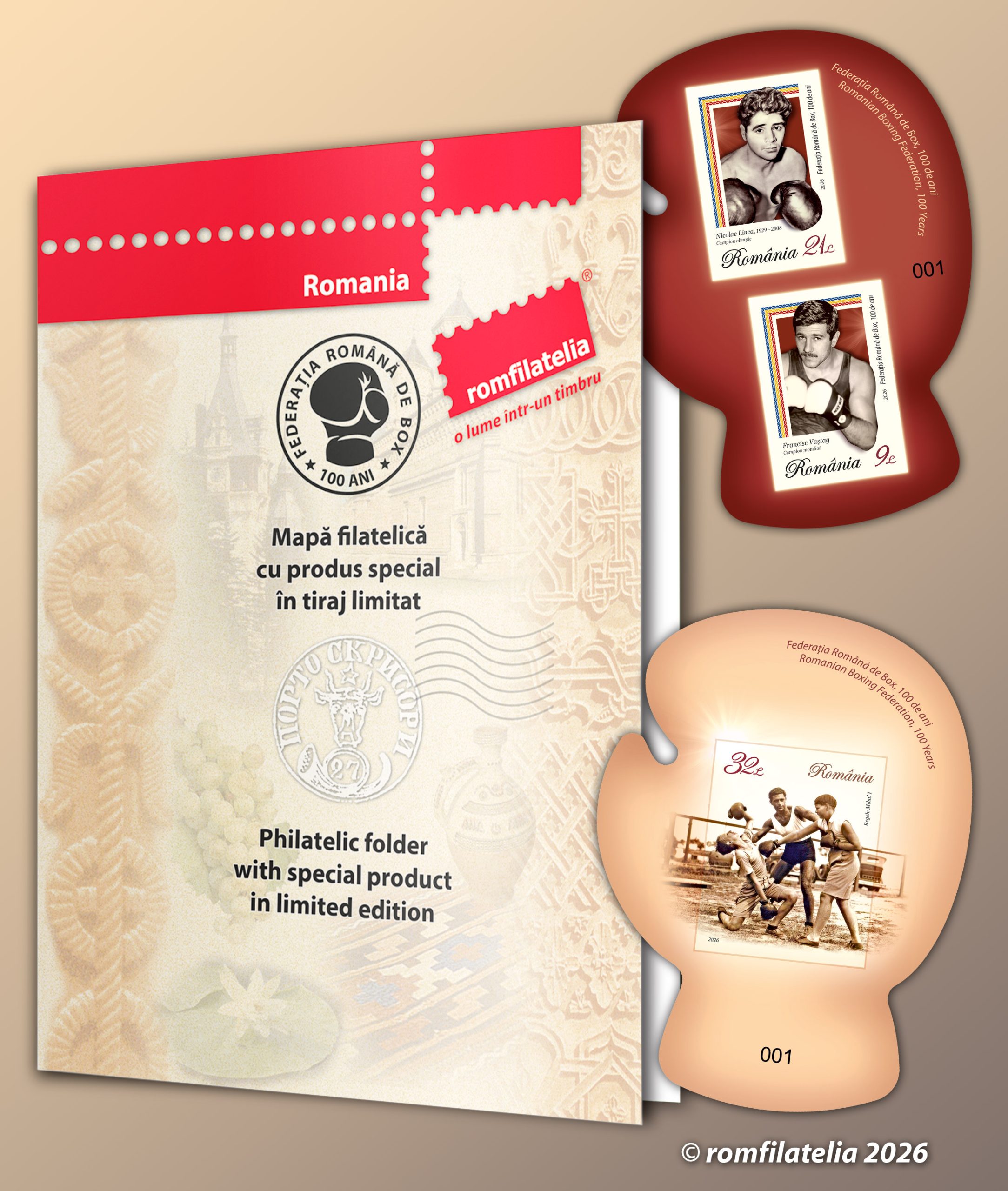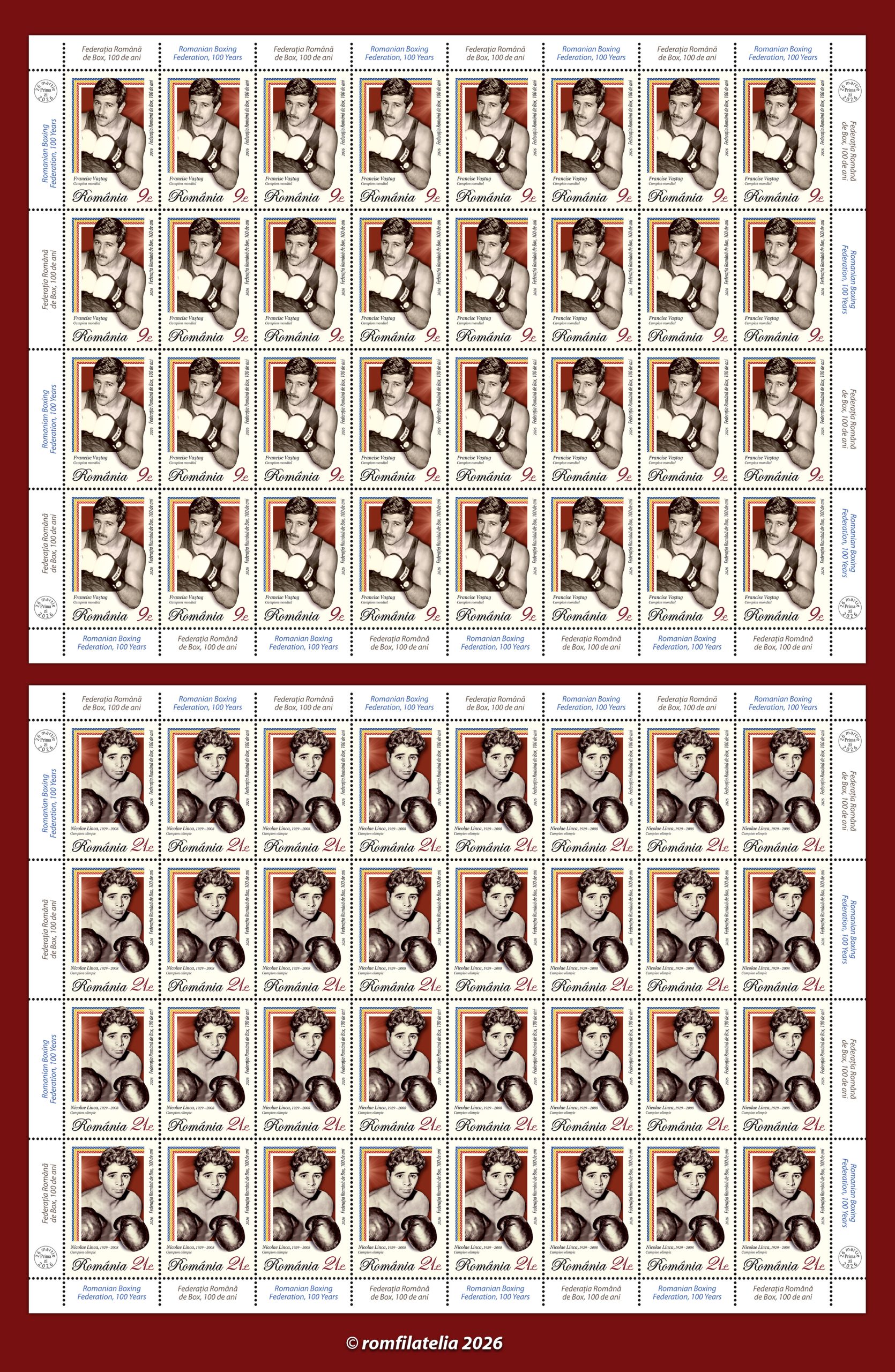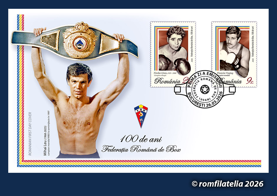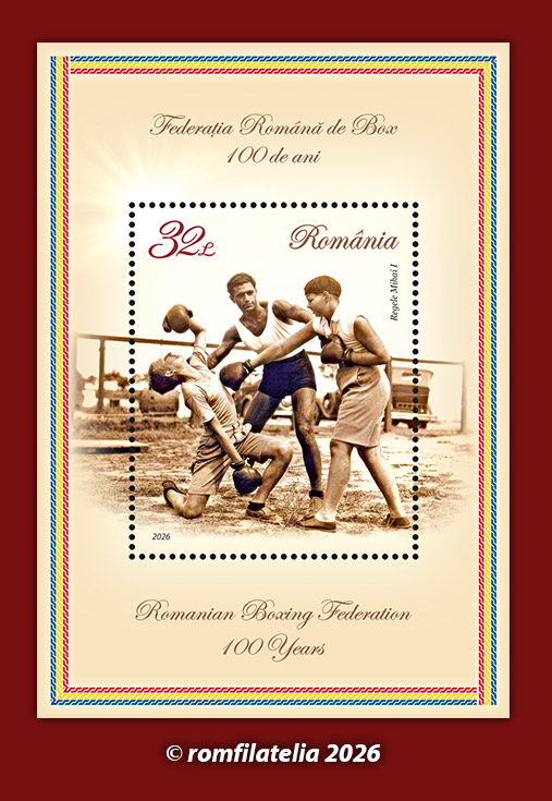 O emisiune filatelică aniversară dedicată unui sport practicat de milenii, de amatori și profesioniști, va fi introdusă în circulație de Romfilatelia și Poșta Română, joi, 26 martie a.c. sub titlul rezumativ FEDERAȚIA ROMÂNĂ DE BOX, 100 DE ANI.