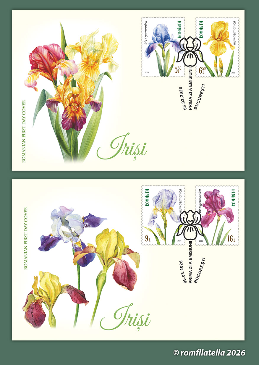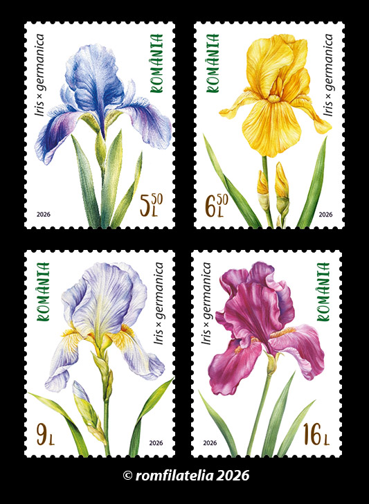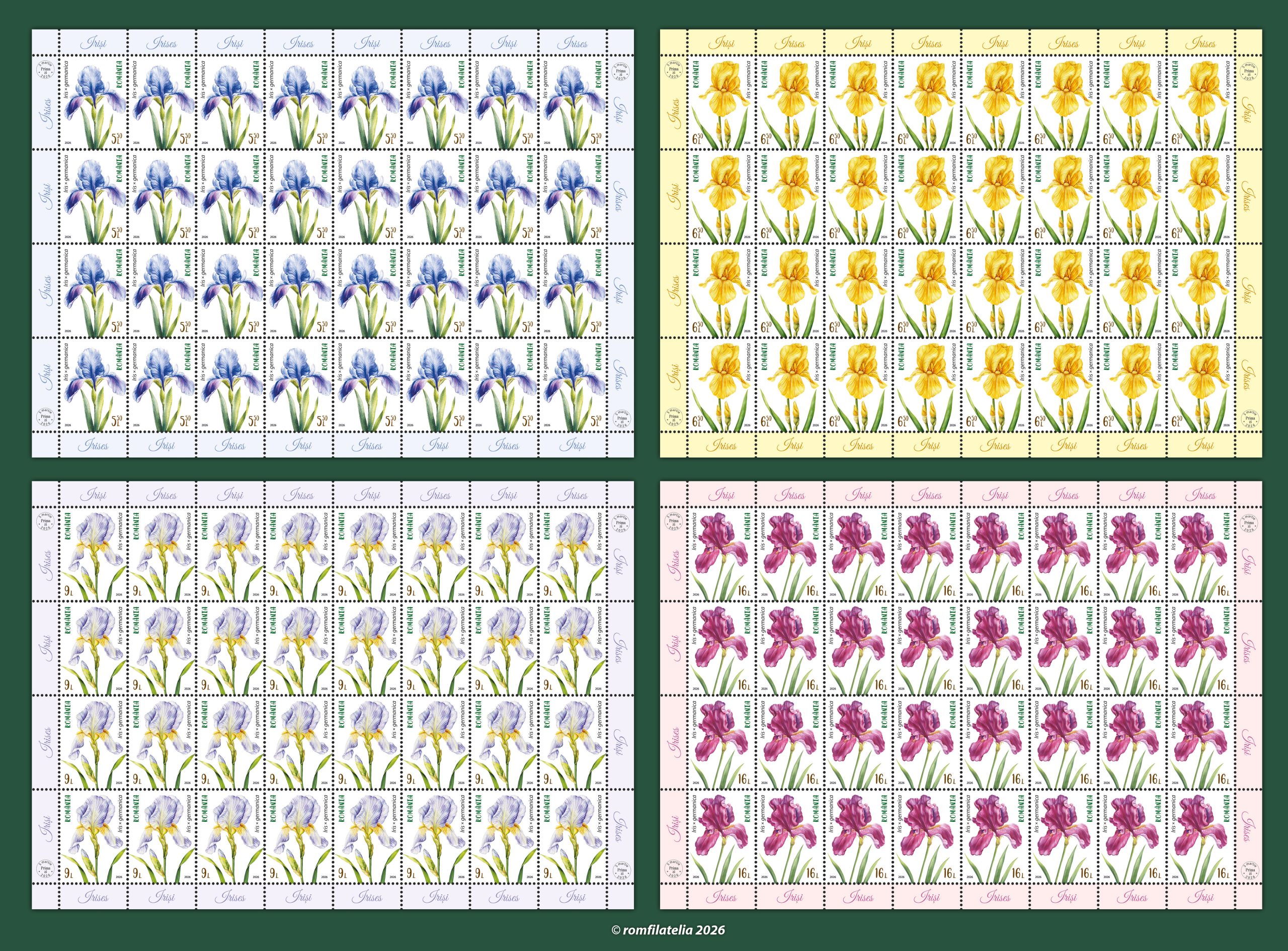 Romfilatelia și Poșta Română ne aduc alături lumea minunată a florilor într-o emisiune filatelică ce urmează să fie introdusă în circulație joi, 5 martie a.c. sub denumirea Iriși, compusă din 4 timbre (cu valorile nominale de 5,50 lei, 6,50 lei, 9 lei și 16 lei) și 2 plicuri „prima zi”, în formate miniaturale.