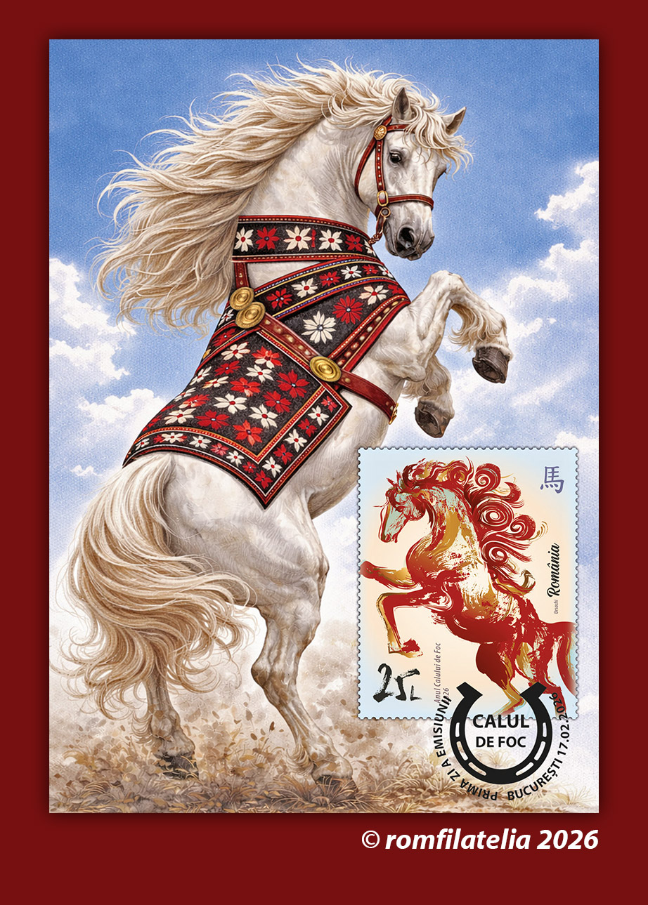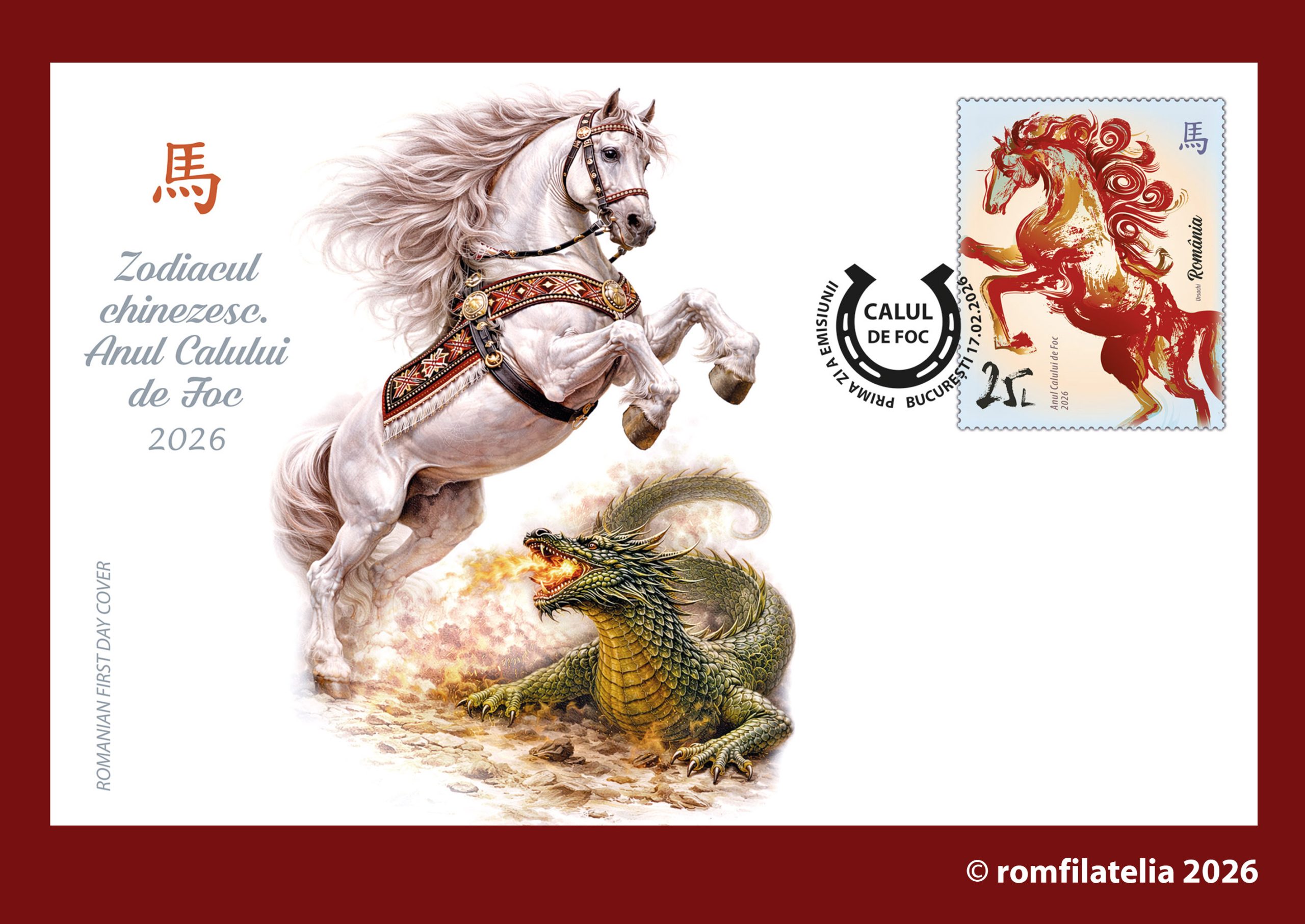 Pentru colecționarii de mărci poștale și pentru amatorii de previziuni ale destinelor personale, Romfilatelia și Poșta Română introduc în circulație marți, 17 februarie a.c., o emisiune filatelică tradițională, Zodiacul chinezesc. Anul Calului de foc, având în componență o marcă poștală cu valoarea de 25 lei, un plic „prima zi” și o carte poștală maximă pentru pasionații de maximafilie.