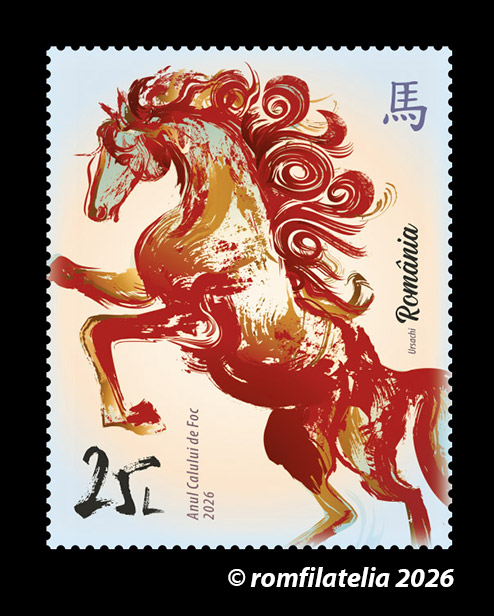 Un detaliu ingenios al graficii timbrului este inserarea armonioasa a anului 2026 stilizat in coama nobilului animal.
