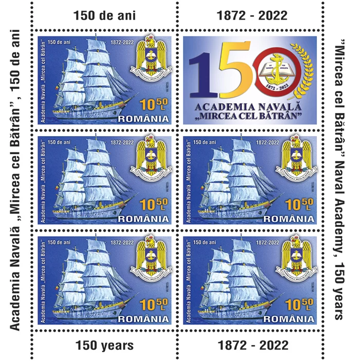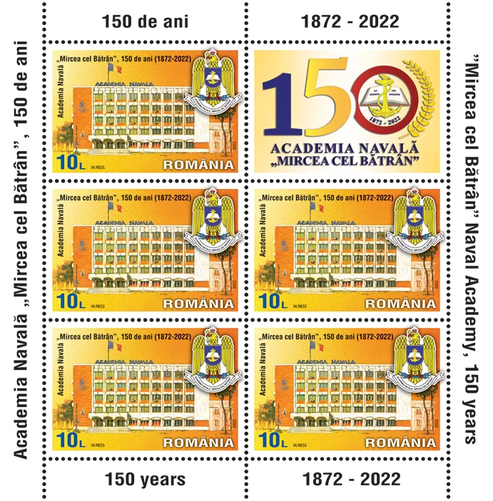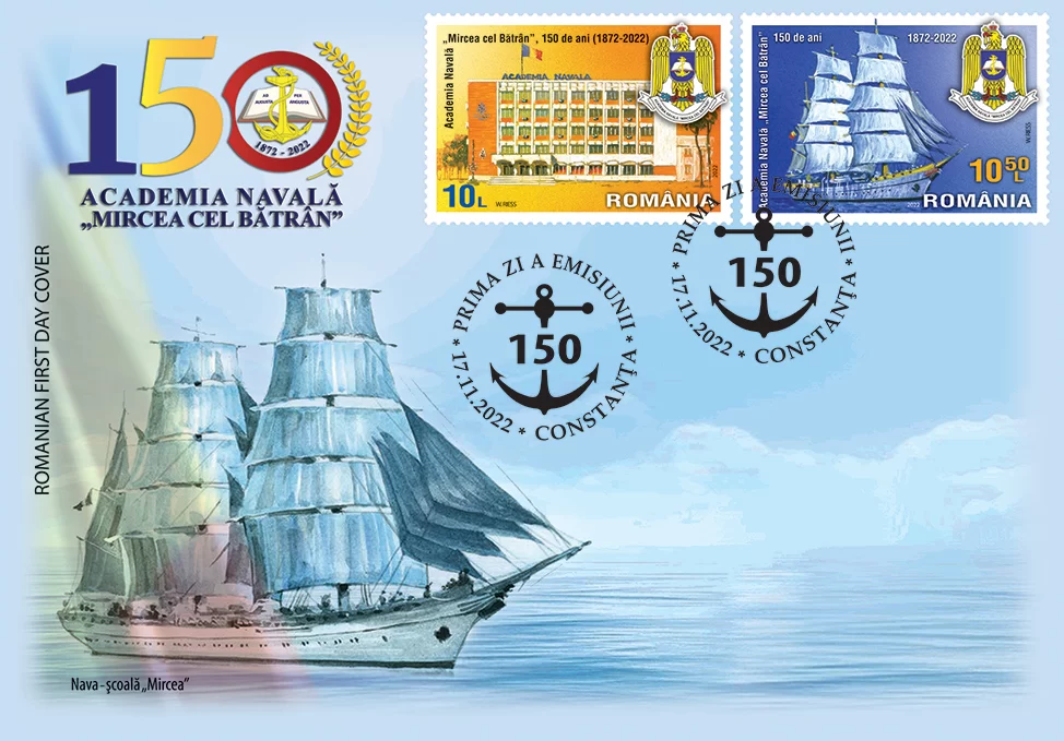 Academia Navală „Mircea cel Bătrân” e în sărbătoare! Romfilatelia se alătură evenimentului şi introduce în circulație joi, 17 noiembrie a.c., emisiunea de mărci poștale Academia Navală „Mircea cel Bătrân”, 150 de ani, dedicată acestei instituții emblematice a României, la aniversarea unui secol și jumătate de existență.