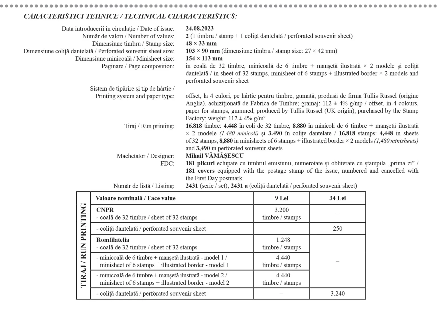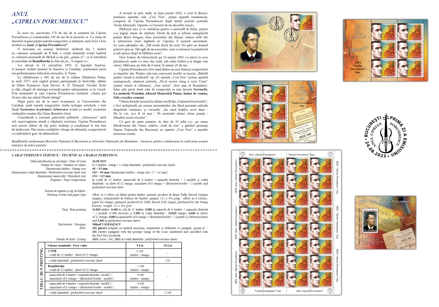 O emisiune cu aceeași titulatură, alcătuită din 1 timbru cu valoarea nominală de 9 Lei, o coliță dantelată având timbrul cu valoarea nominală de 34 Lei și un plic „prima zi”, va fi introdusă în circulație de Romfilatelia la data de joi, 24 august a.c.