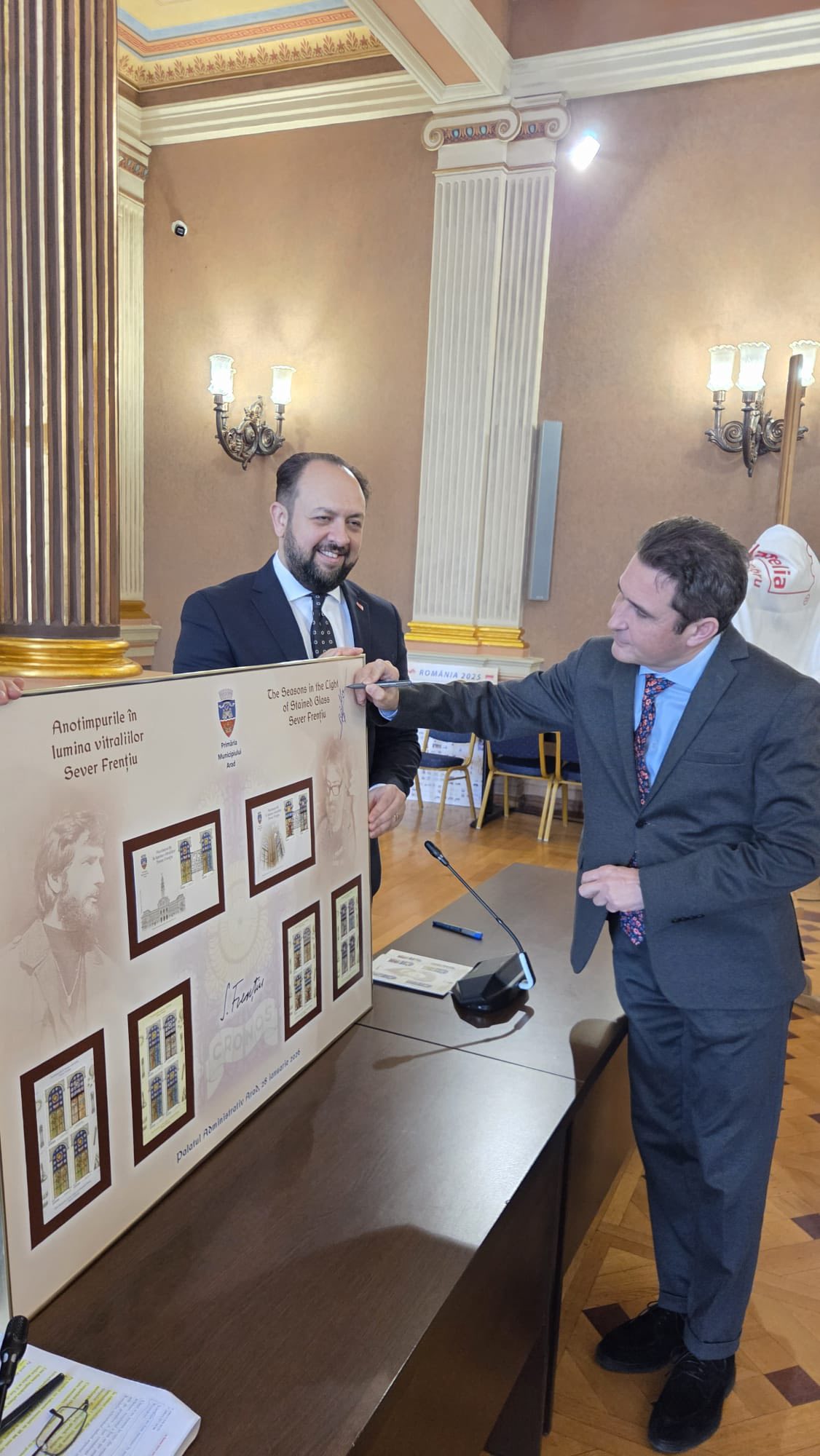 Vitraliile monumentale create de Sever Frențiu, realizate din sticlă de Murano și montate în 1977 în clădirea Primăria Municipiului Arad, devin astăzi artă filatelică – o punte între patrimoniu, lumină și memorie.