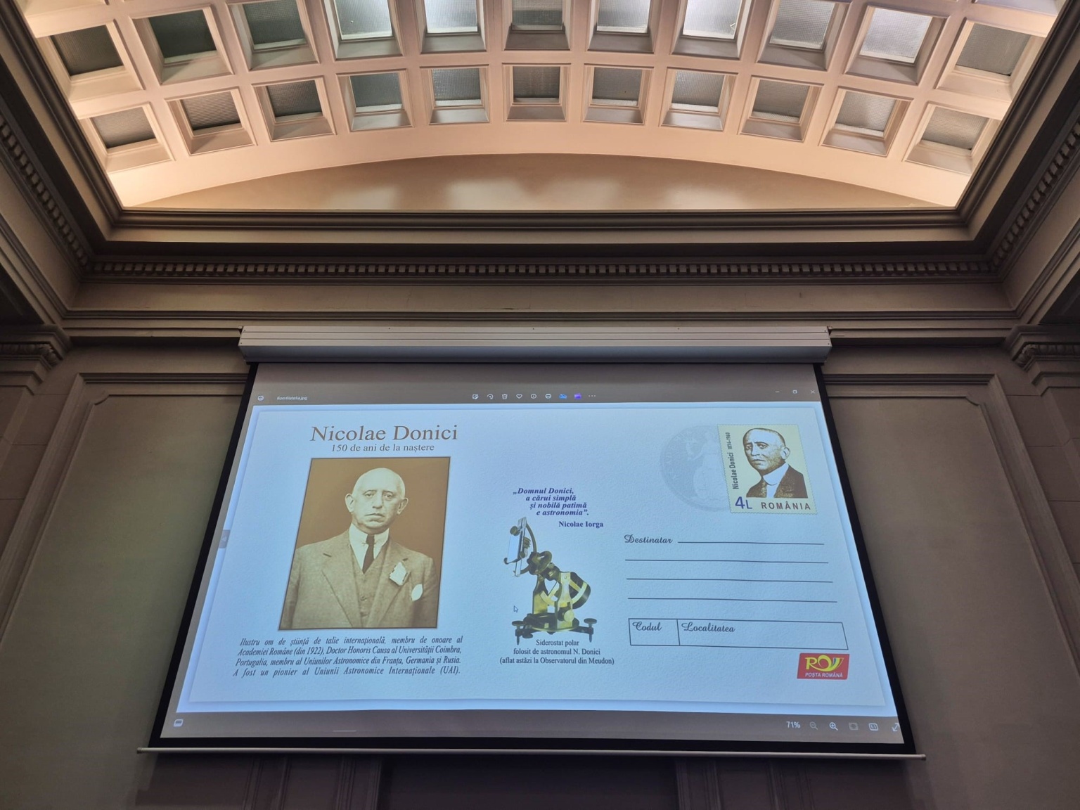 Romfilatelia, în calitatea sa de partener instituțional, s-a alăturat evenimentului, prin prezentarea unui întreg poștal omagial cu timbru marcă fixă, dedicat astronomului și savantului Nicolae Donici, membru de onoare al Academiei Române.