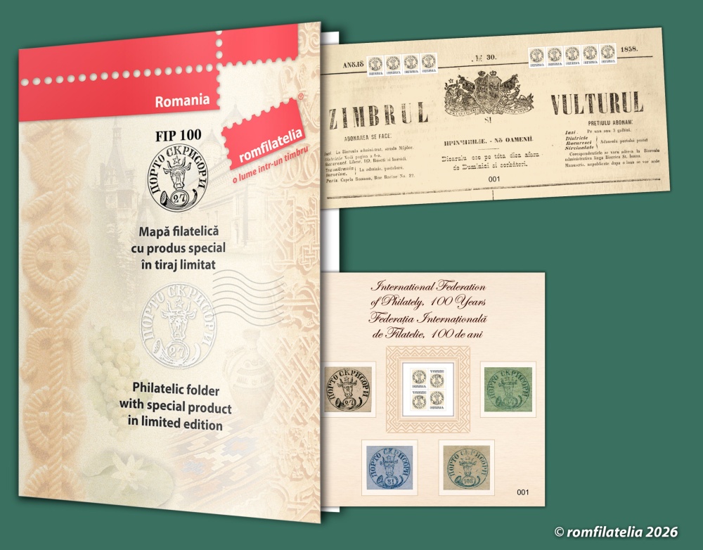 Premieră filatelică mondială Pentru a marca aniversarea Centenarului unei organizații reprezentative pentru domeniul filatelic, la nivel mondial, Romfilatelia și Poșta Română introduc în circulație joi, 26 februarie a.c., emisiunea de mărci poștale Federația Internațională de Filatelie, 100 de ani. Emisiunea, are în componență o marcă poștală, o coliță dantelată, un plic „prima zi”, în format