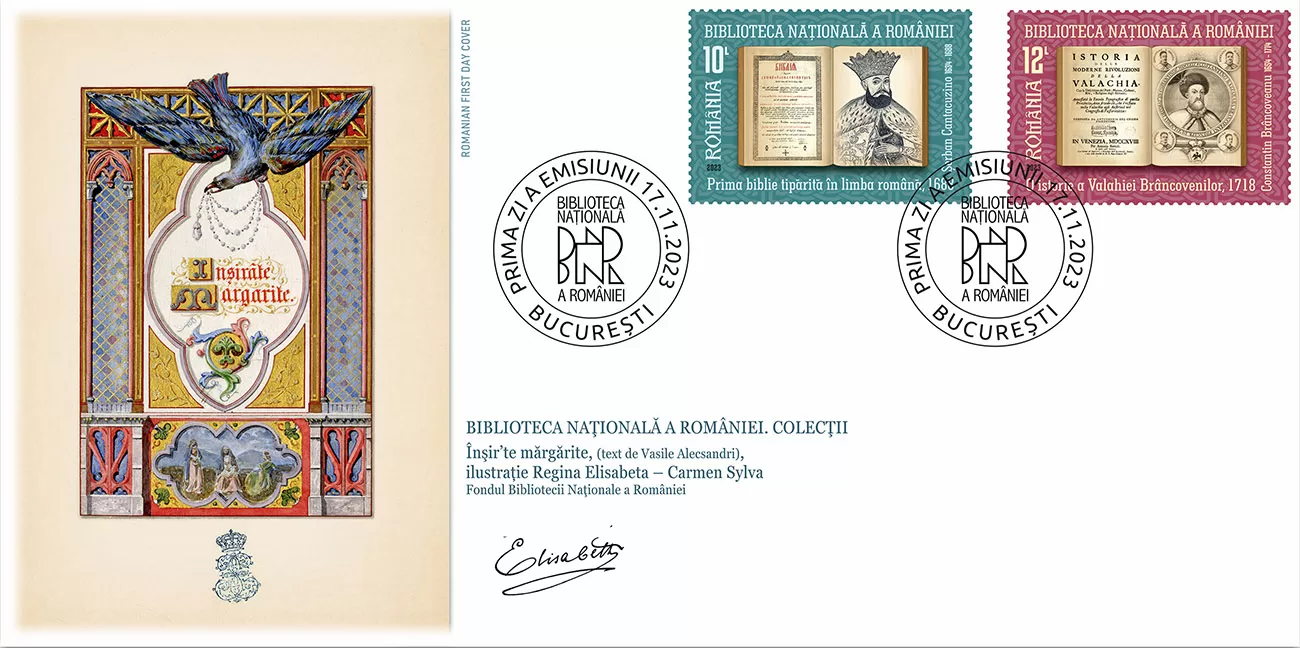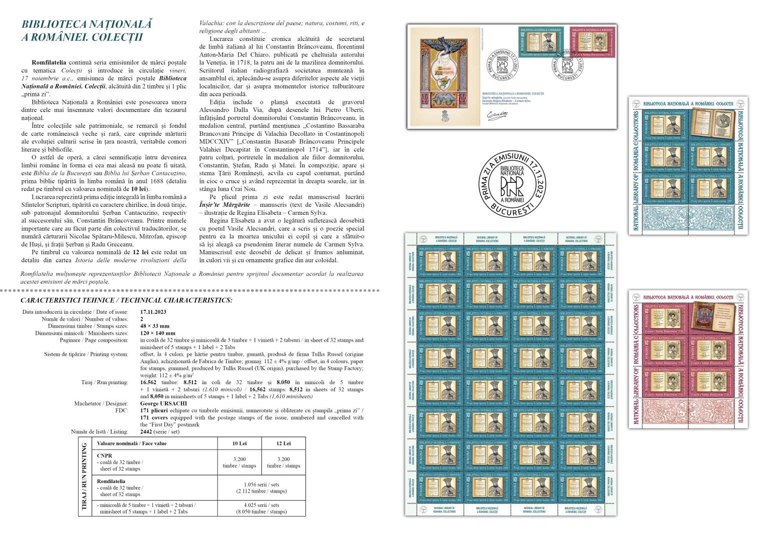 Romfilatelia continuă seria emisiunilor de mărci poștale cu tematica Colecții și introduce în circulație vineri, 17 noiembrie a.c., emisiunea de mărci poștale Biblioteca Națională a României. Colecții, alcătuită din 2 timbre și 1 plic „prima zi”.