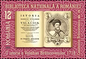 Pe timbrul cu valoarea nominală de 12 lei este redat un detaliu din cartea Istoria delle moderne rivoluzioni della Valachia: con la descrizione del paese; natura, costumi, riti, e religione degli abitanti …