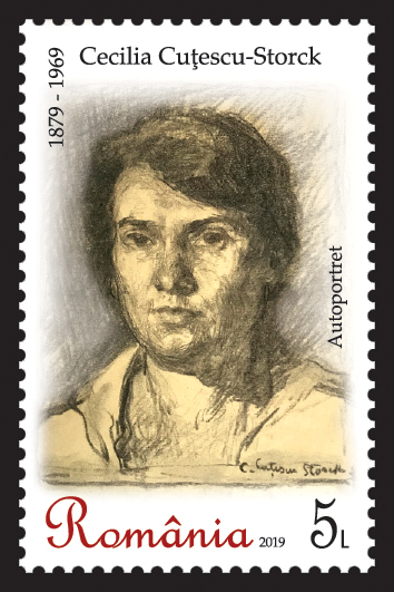 Pe timbrul emisiunii cu valoarea de 5 lei este ilustrat autoportretul Ceciliei Cuțescu-Storck. Acesta poate fi datat în jurul anului 1930, când artista se afla în plină maturitate şi la apogeul carierei sale. Desenul este o lucrare foarte preţioasă şi rară pentru că pictoriţei nu-i plăcea de obicei să se autoreprezinte. Schiţa este însă semnată ceea ce demonstrează că, de această dată, Cecilia Cuţescu-Storck a fost mulţumită de rezultatul muncii sale.