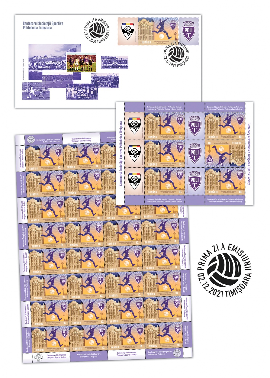 Emisiunea de mărci poștale, ce conține 1 timbru și un plic „prima zi”, este dedicată sărbătoririi a o sută de ani de la înființarea Societății Sportive Politehnica Timișoara. Pe timbrul cu valoarea nominală de 10 lei, este redată silueta unui fotbalist alături de un detaliu architectonic al fațadei Universității Politehnice Timișoara și actuala siglă a Societății Sportive Politehnica Timișoara.