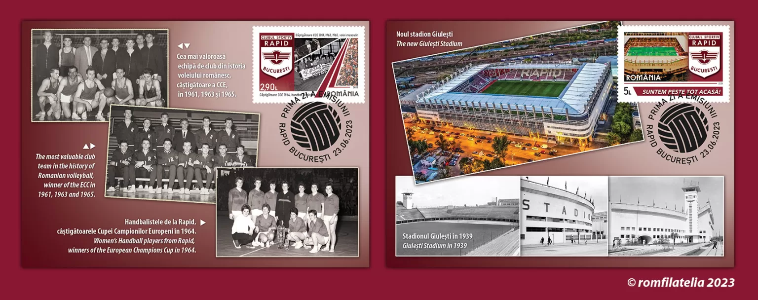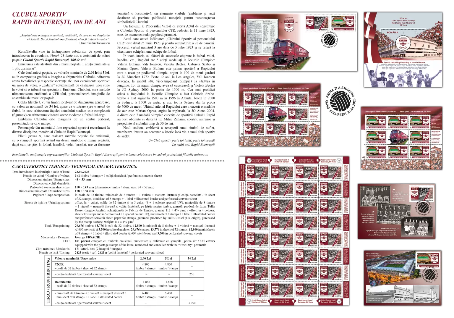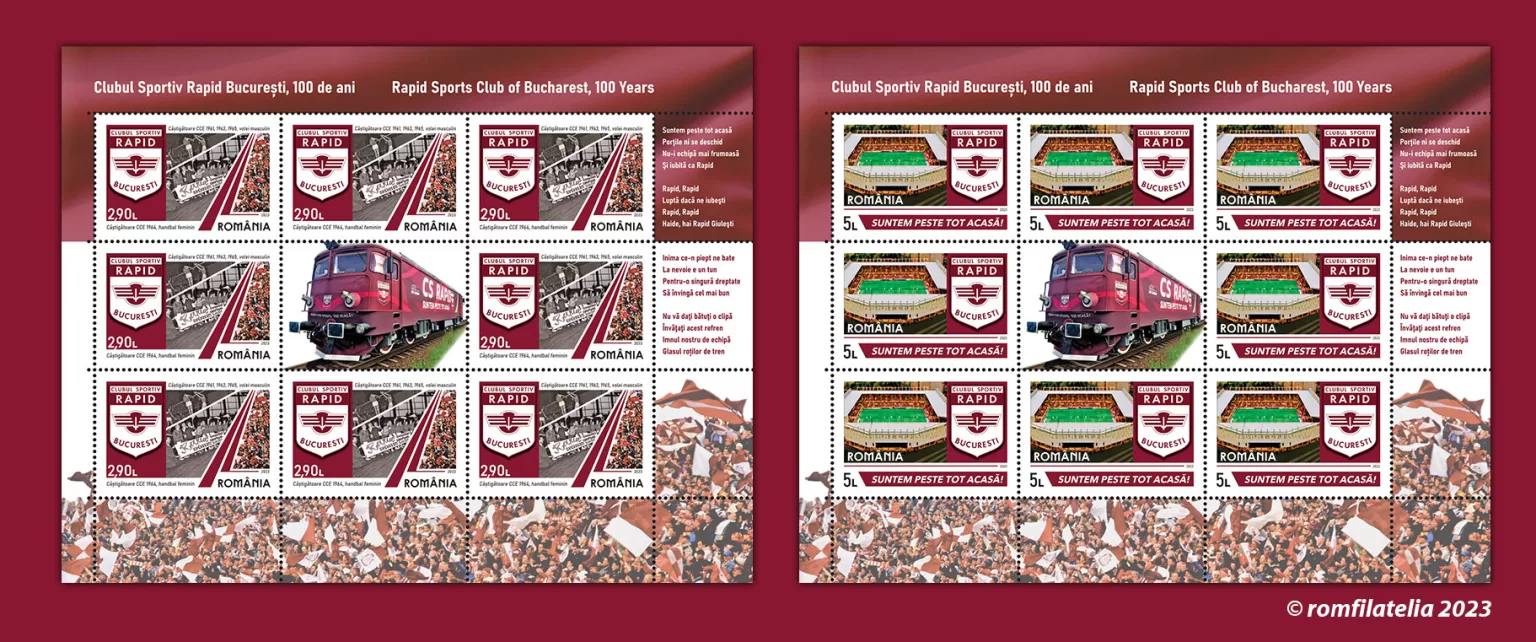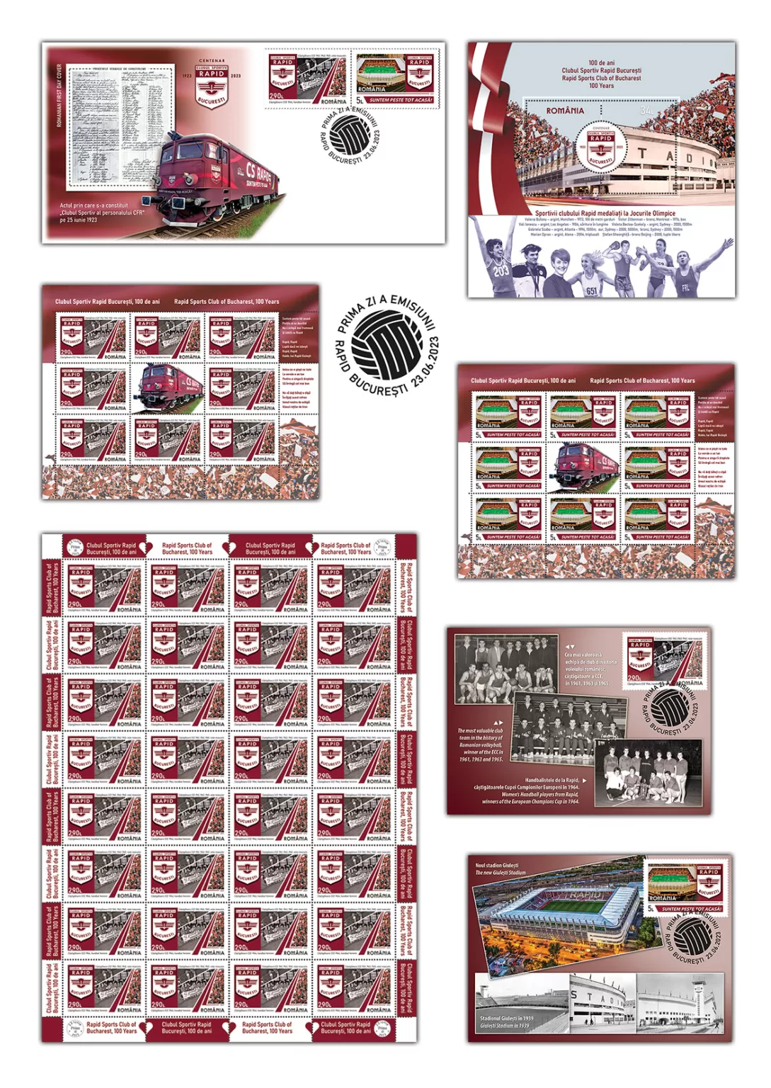 Romfilatelia vine în întâmpinarea iubitorilor de sport, prin introducerea în circulație, Vineri, 23 iunie a.c. a emisiunii de mărci poștale Clubul Sportiv Rapid București, 100 de ani.