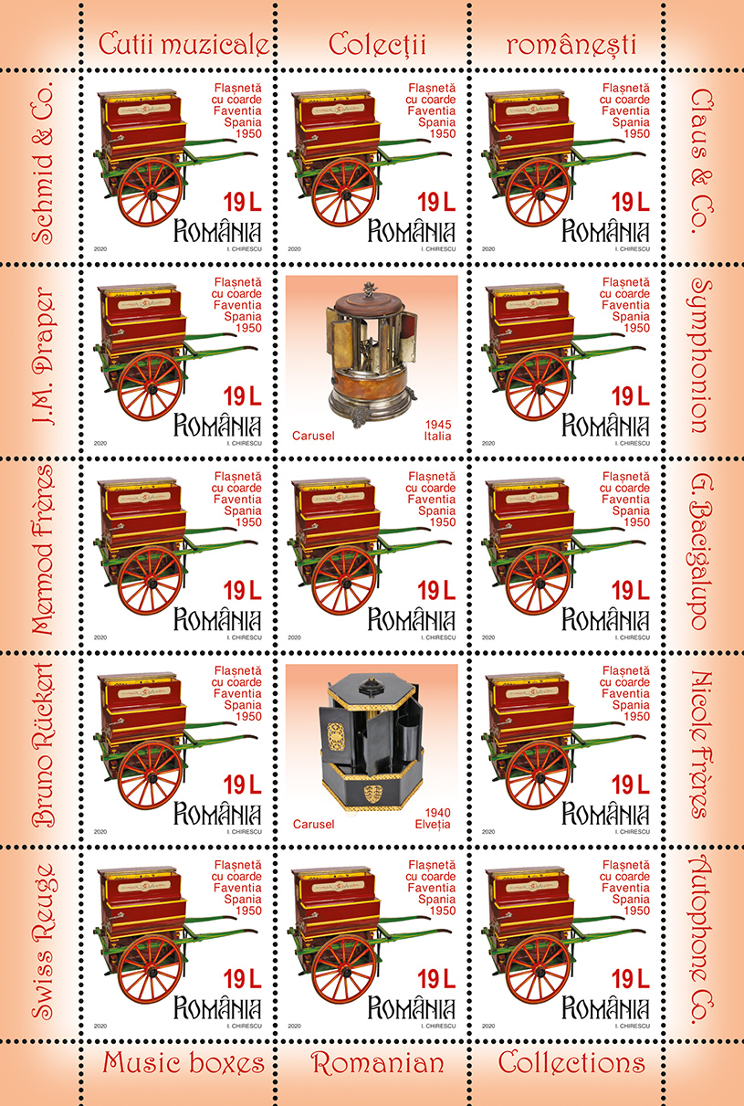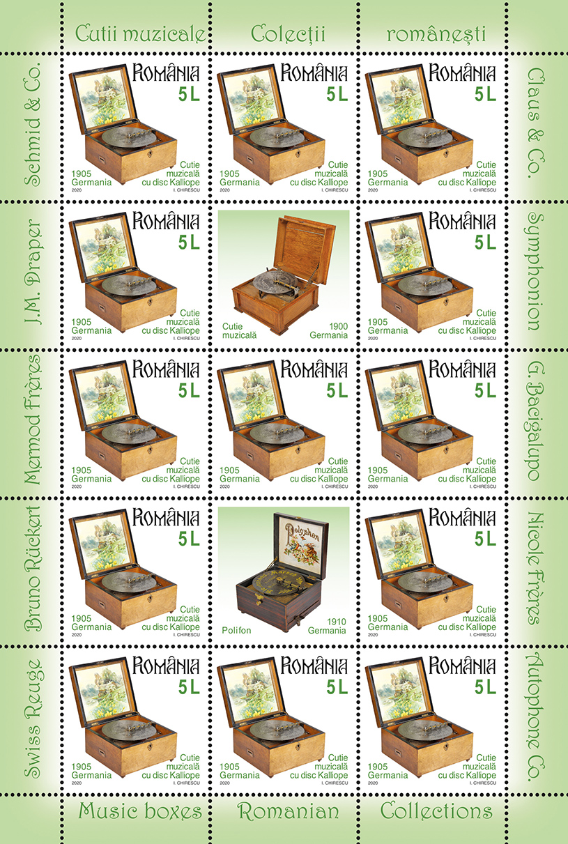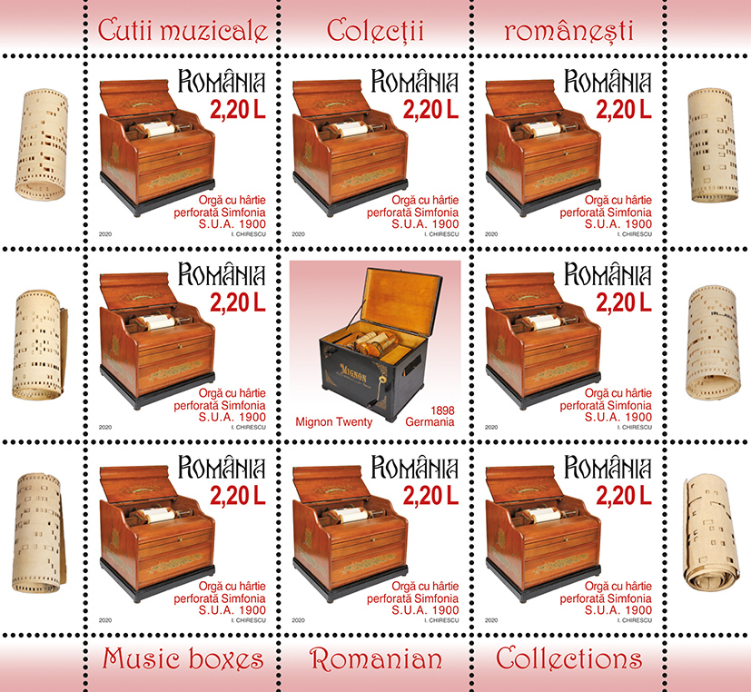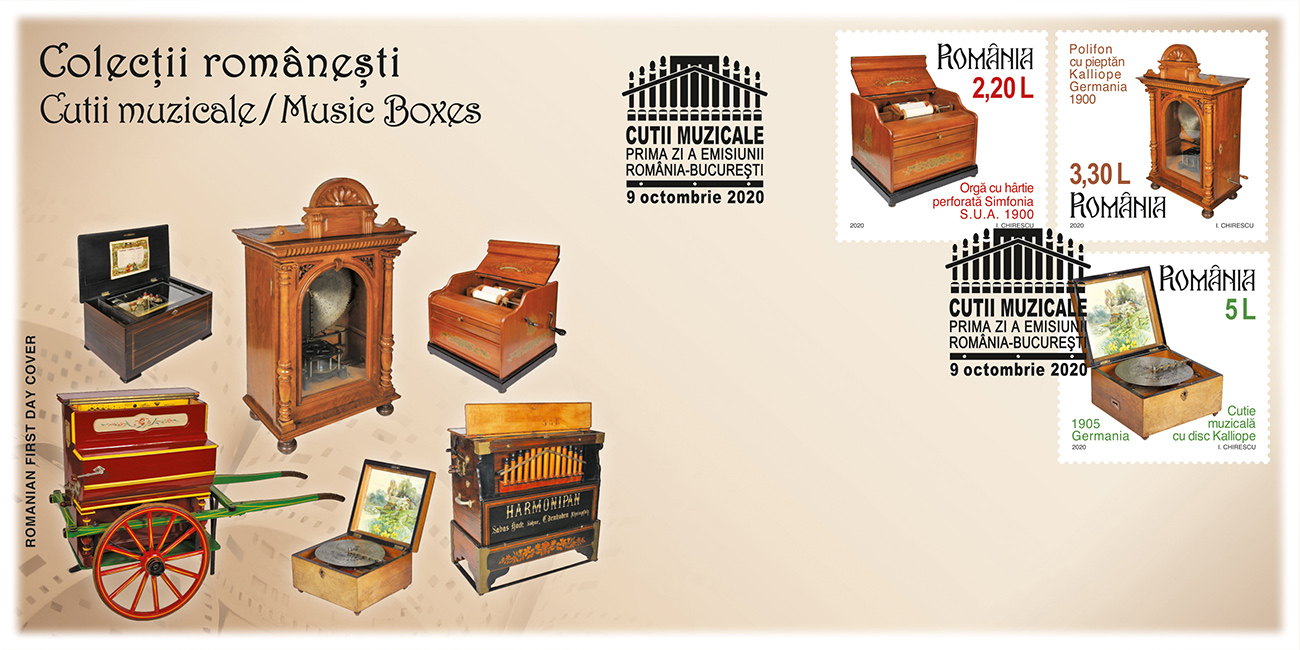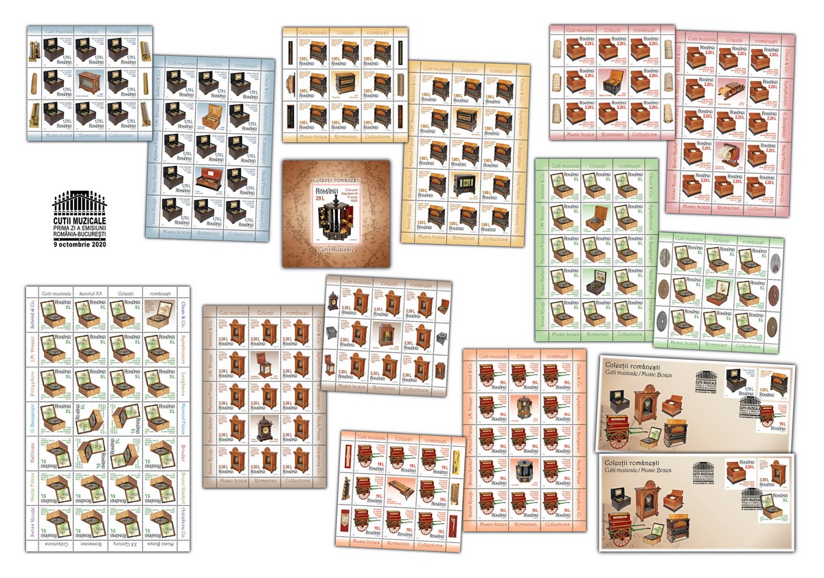 Emisiunea de mărci poștale „Colecțiilor românești. Cutii muzicale” va fi disponibilă începând de vineri, 9 octombrie 2020, în magazinele Romfilatelia din București, Bacău, Brașov, Cluj-Napoca, Iași, Timișoara, precum și în magazinul nostru online: https://romfilatelia.ro/store/. Aceasta este completată de cele două plicuri „prima zi”, coala de 27 timbre + 1 vinietă + 14 tabsuri și tęte-bęche, minicoala de 13 timbre + 2 viniete diferite + 10 tabsuri, minicoala de 8 timbre + 1 vinietă + 6 tabsuri și coliţă dantelată.