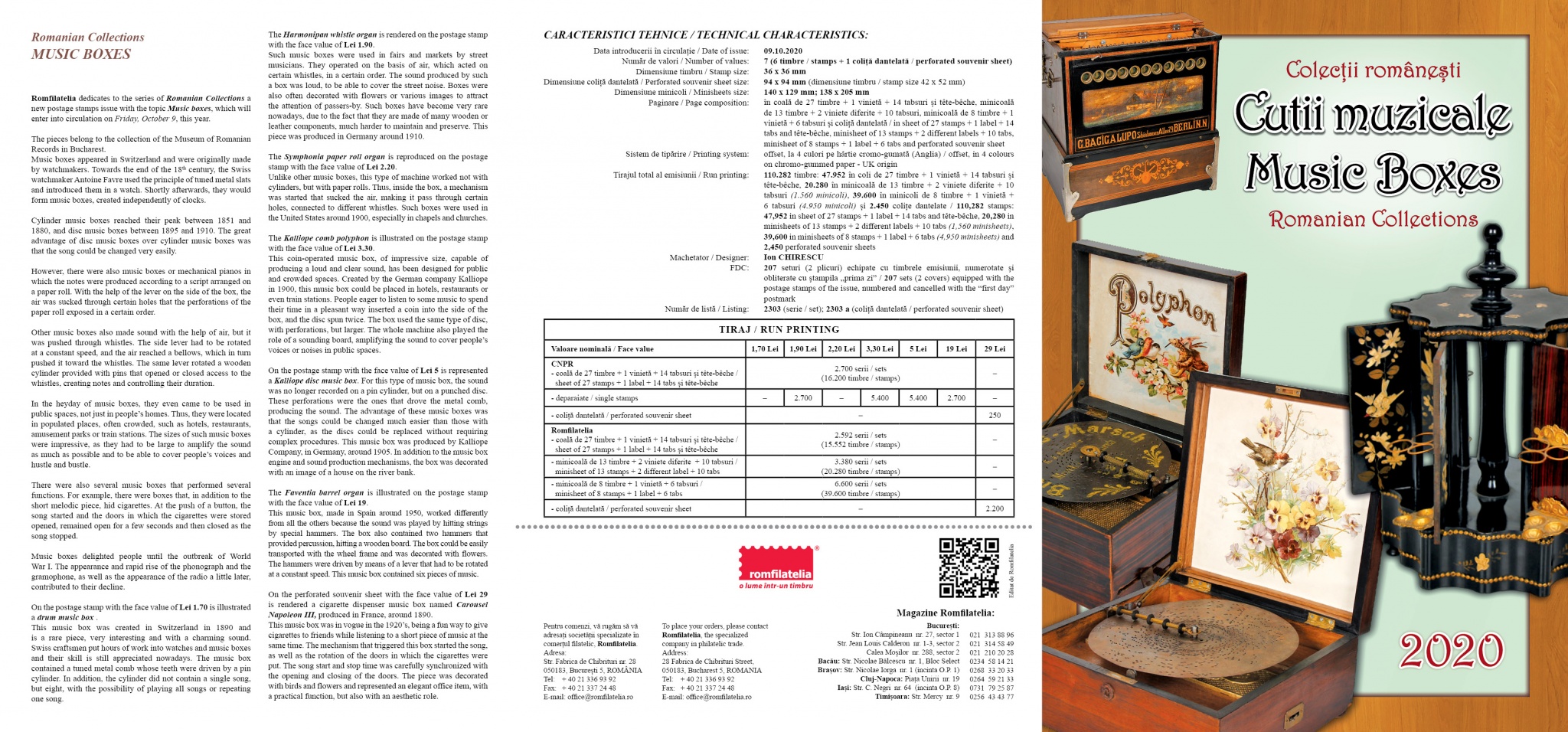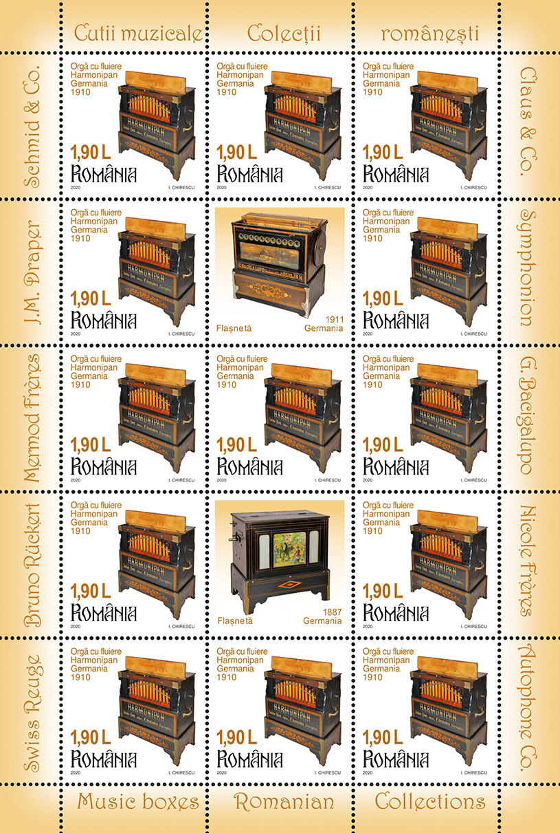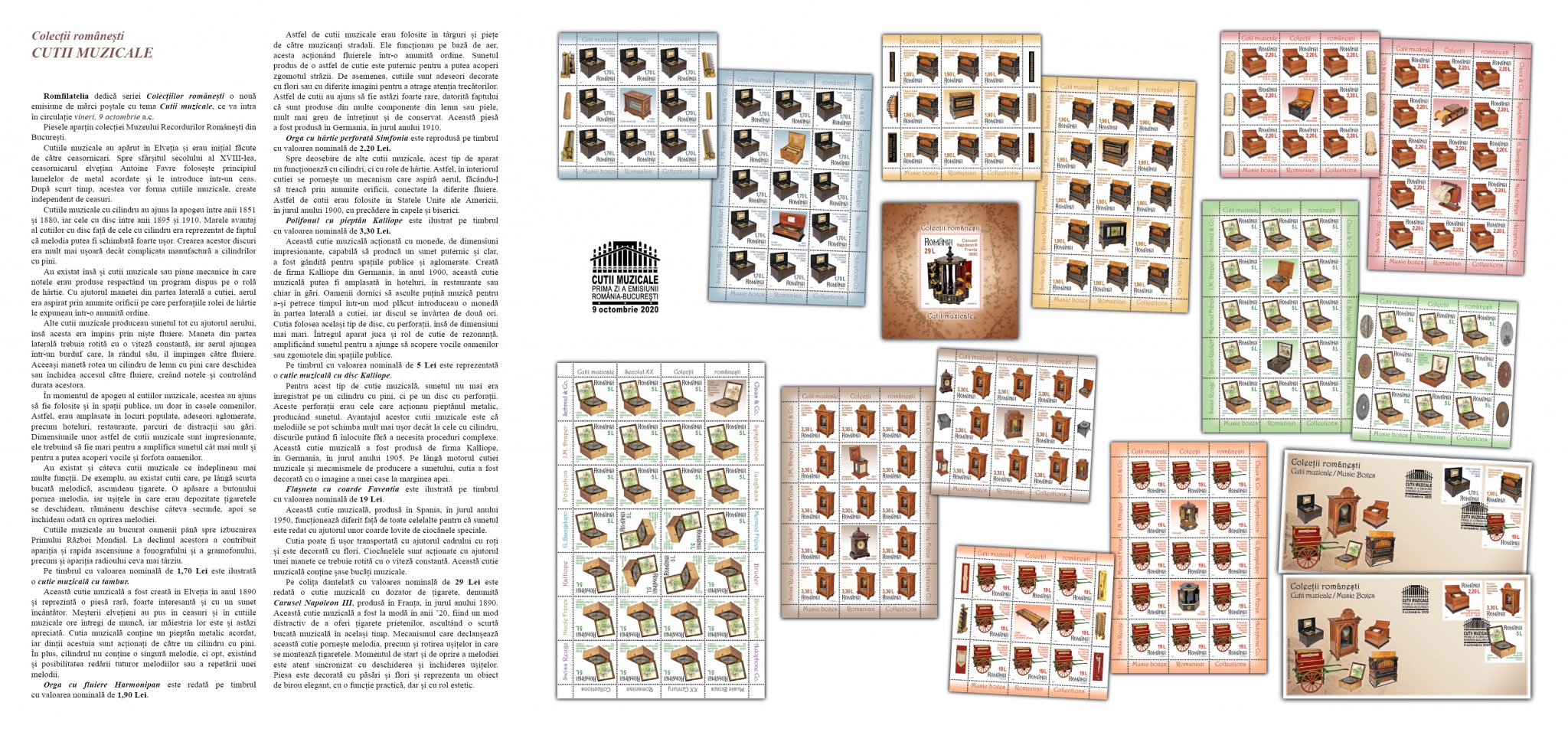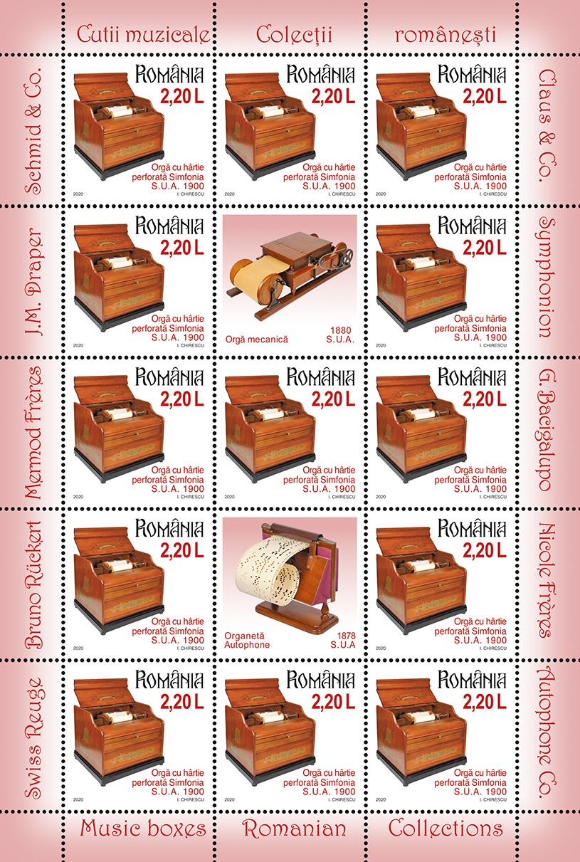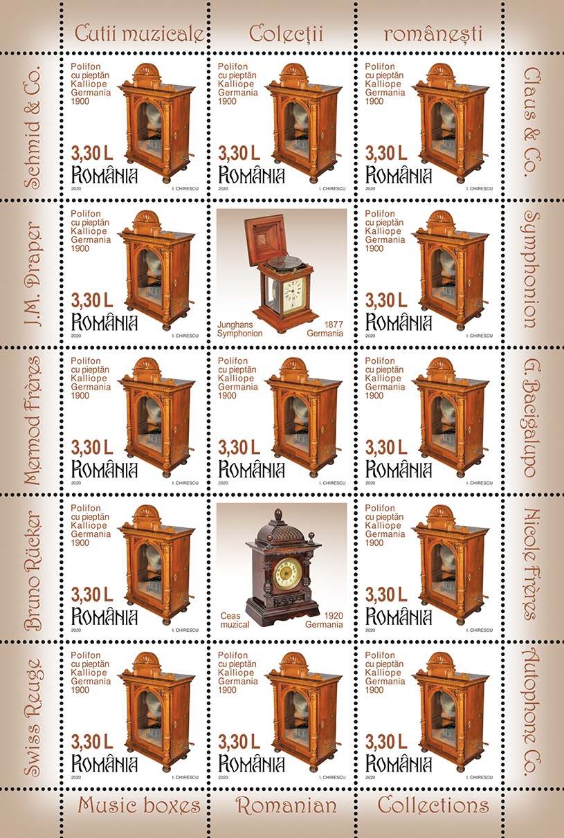 Emisiunea de mărci poștale „Colecțiilor românești. Cutii muzicale” va fi disponibilă începând de vineri, 9 octombrie 2020, în magazinele Romfilatelia din București, Bacău, Brașov, Cluj-Napoca, Iași, Timișoara, precum și în magazinul nostru online: https://romfilatelia.ro/store/. Aceasta este completată de cele două plicuri „prima zi”, coala de 27 timbre + 1 vinietă + 14 tabsuri și tęte-bęche, minicoala de 13 timbre + 2 viniete diferite + 10 tabsuri, minicoala de 8 timbre + 1 vinietă + 6 tabsuri și coliţă dantelată.