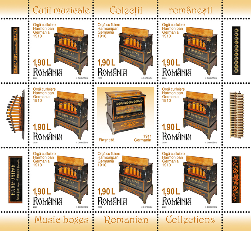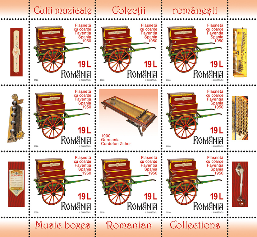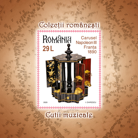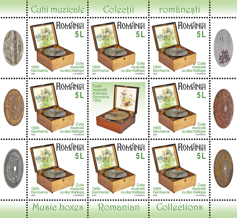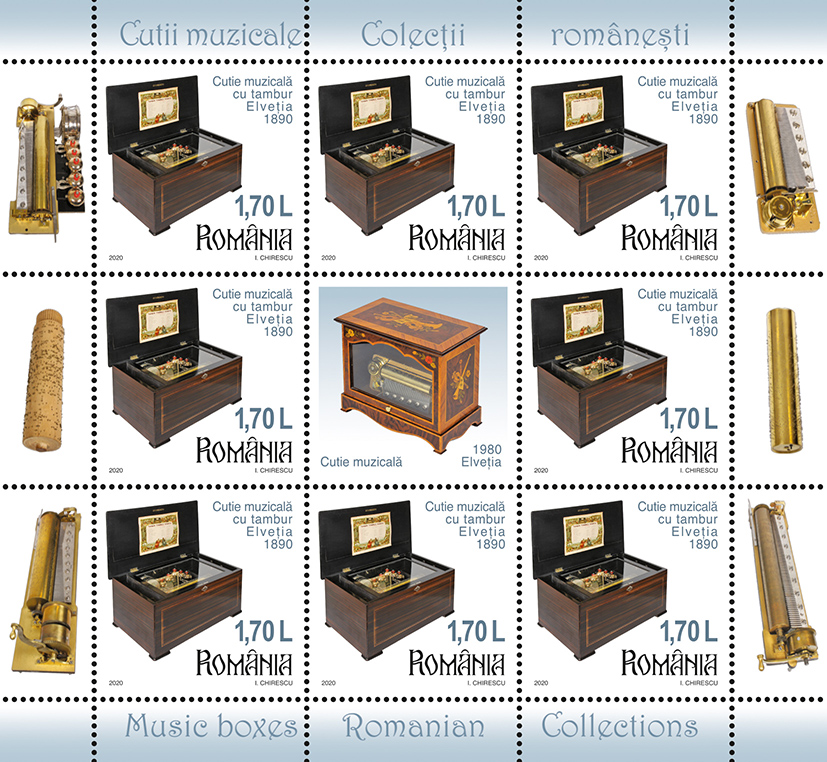 Romfilatelia dedică seriei Colecțiilor românești o nouă emisiune de mărci poștale cu tema Cutii muzicale, ce va intra în circulație vineri, 9 octombrie a.c.