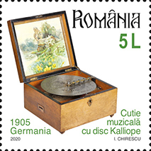 Pe timbrul cu valoarea nominală de 5 Lei este reprezentată o cutie muzicală cu disc Kalliope.