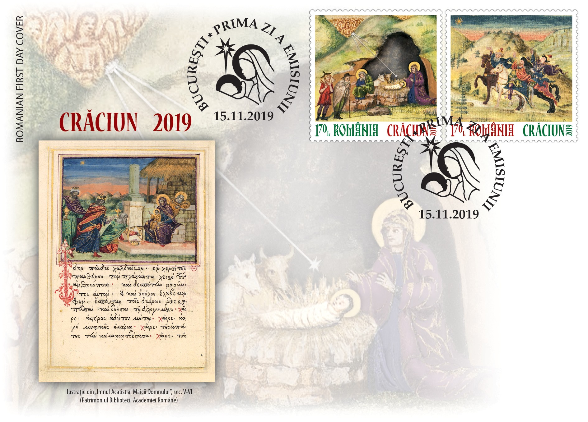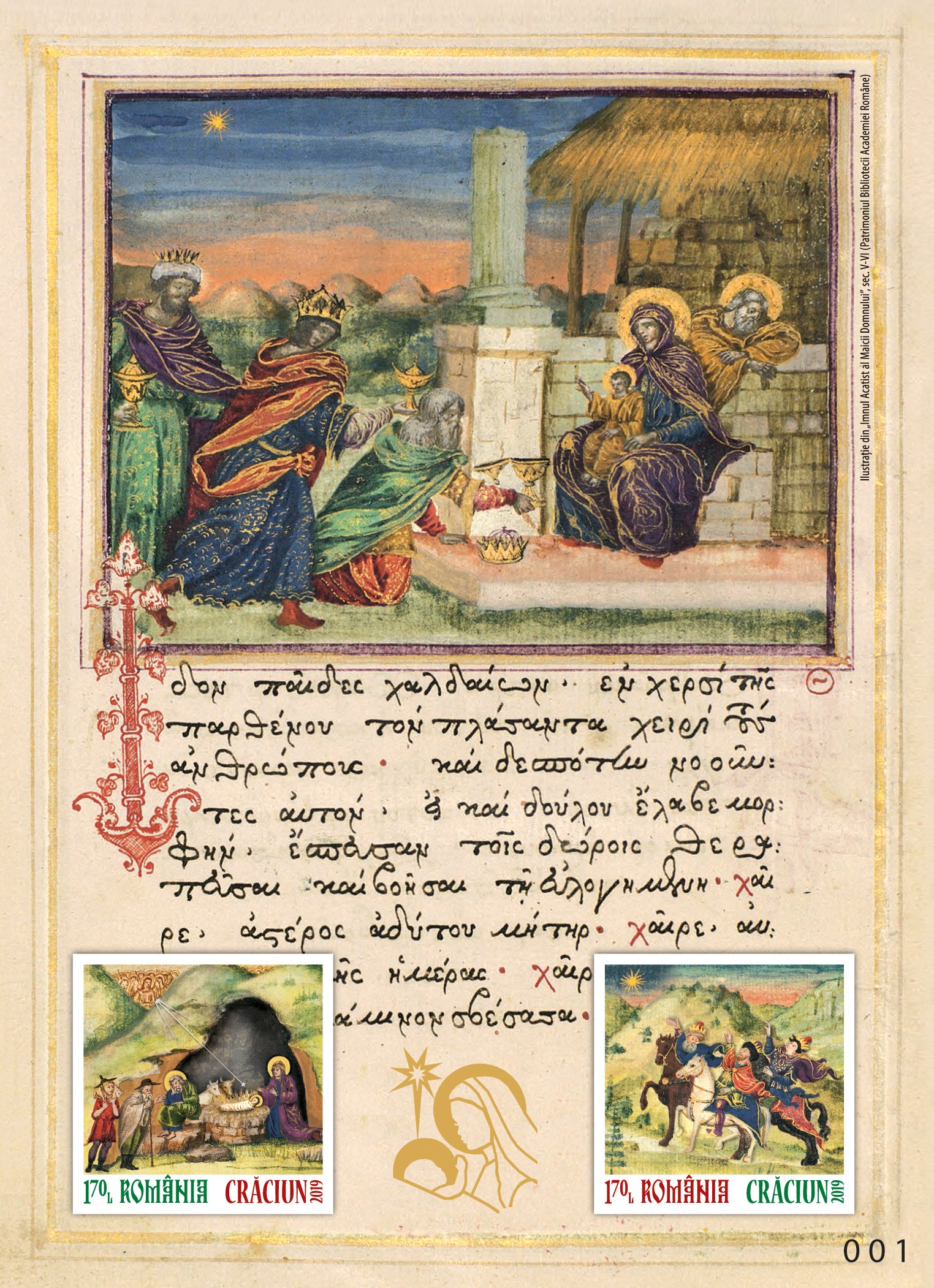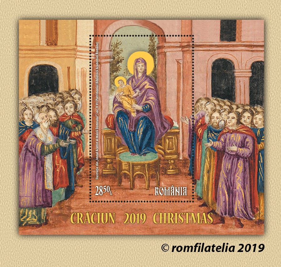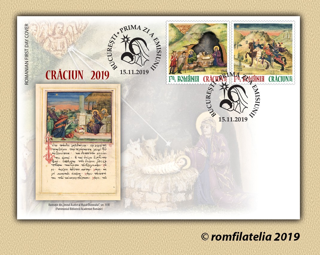 Pe cele două timbre ale emisiunii de mărci poștale, ambele cu valoarea nominală de 1,70 lei, sunt ilustrate imagini din manuscrisul Imnul Acatist al Maicii Domnului din colecția Bibliotecii Academiei Române, reprezentând miniaturile „Nașterea Domnului” și „Steaua Magilor”.