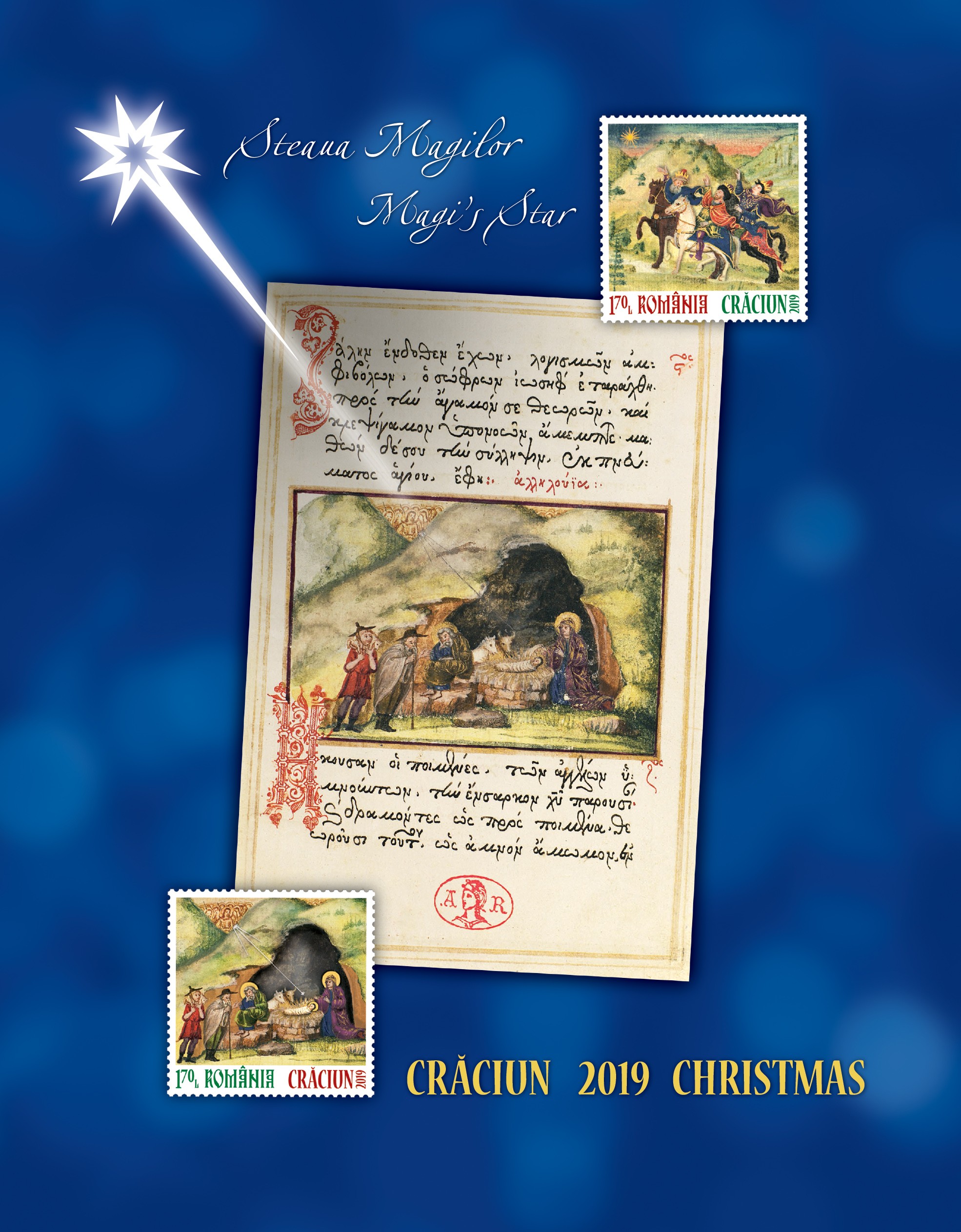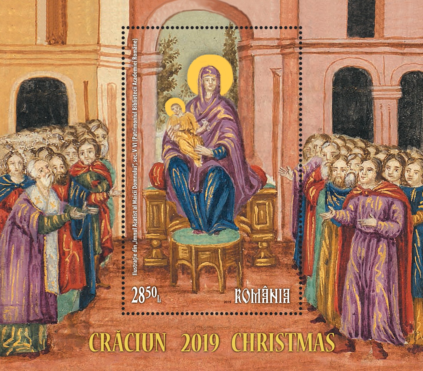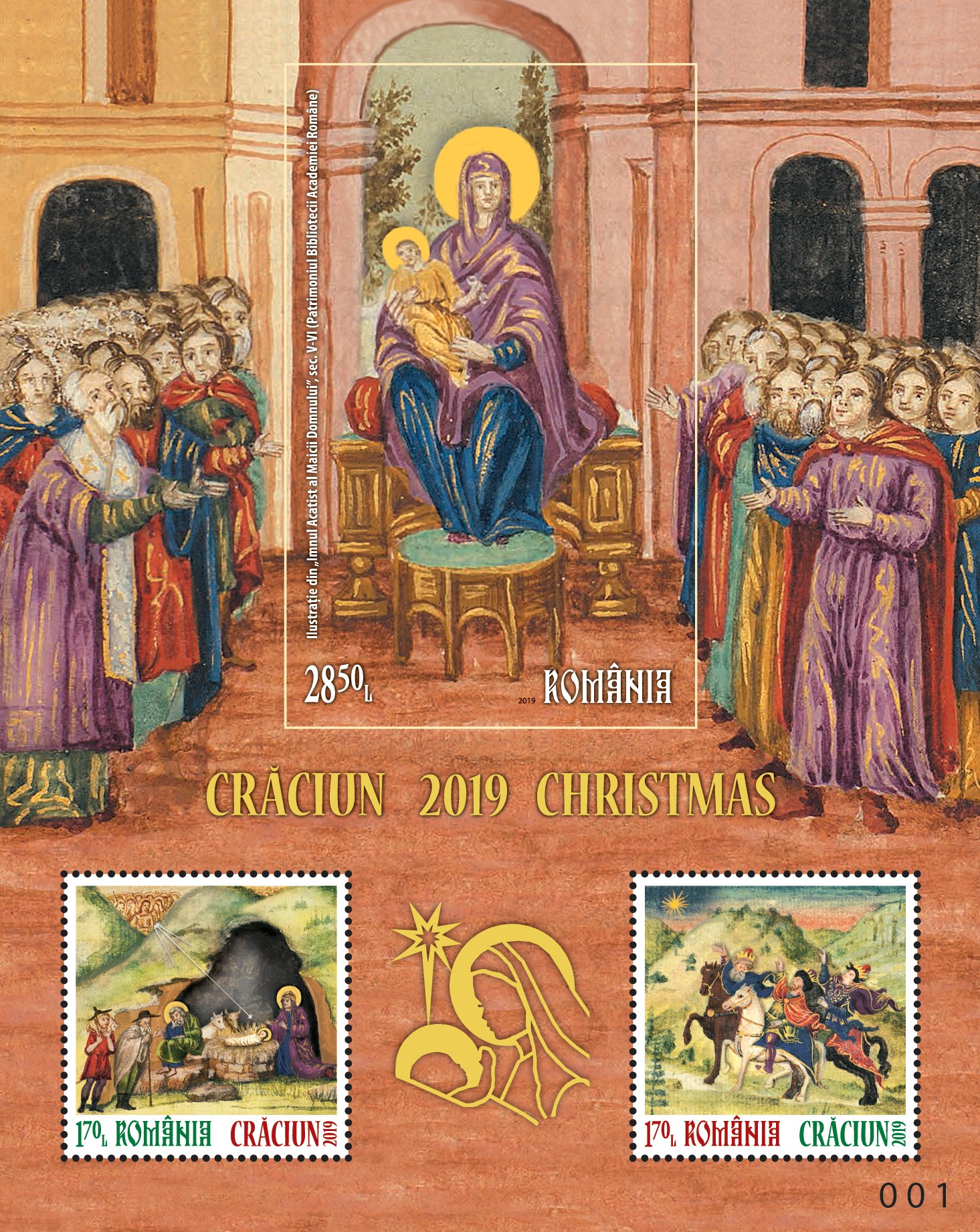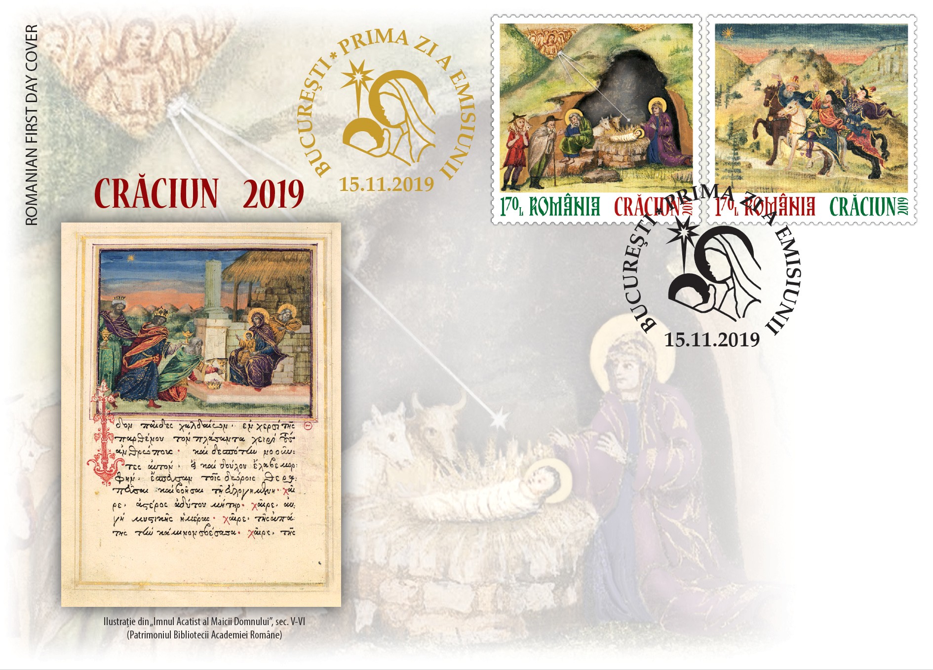 Pe cele două timbre ale emisiunii de mărci poștale, ambele cu valoarea nominală de 1,70 lei, sunt ilustrate imagini din manuscrisul Imnul Acatist al Maicii Domnului din colecția Bibliotecii Academiei Române, reprezentând miniaturile „Nașterea Domnului” și „Steaua Magilor”.
