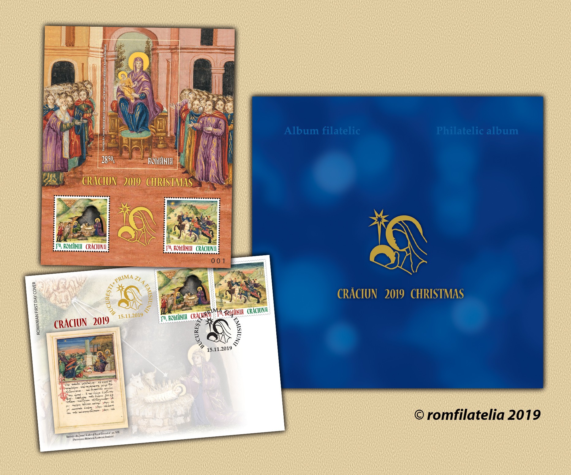 Albumul filatelic este realizat în tiraj limitat de 367 de exemplare și este echipat cu blocul special al emisiunii (conținând două timbre + coliță nedantelată), cu elemente grafice cu folio aur, precum și plicul „prima zi” având ștampila „prima zi” aplicată în clar, în folio aur, ambele produse fiind numerotate de la 001 la 367.