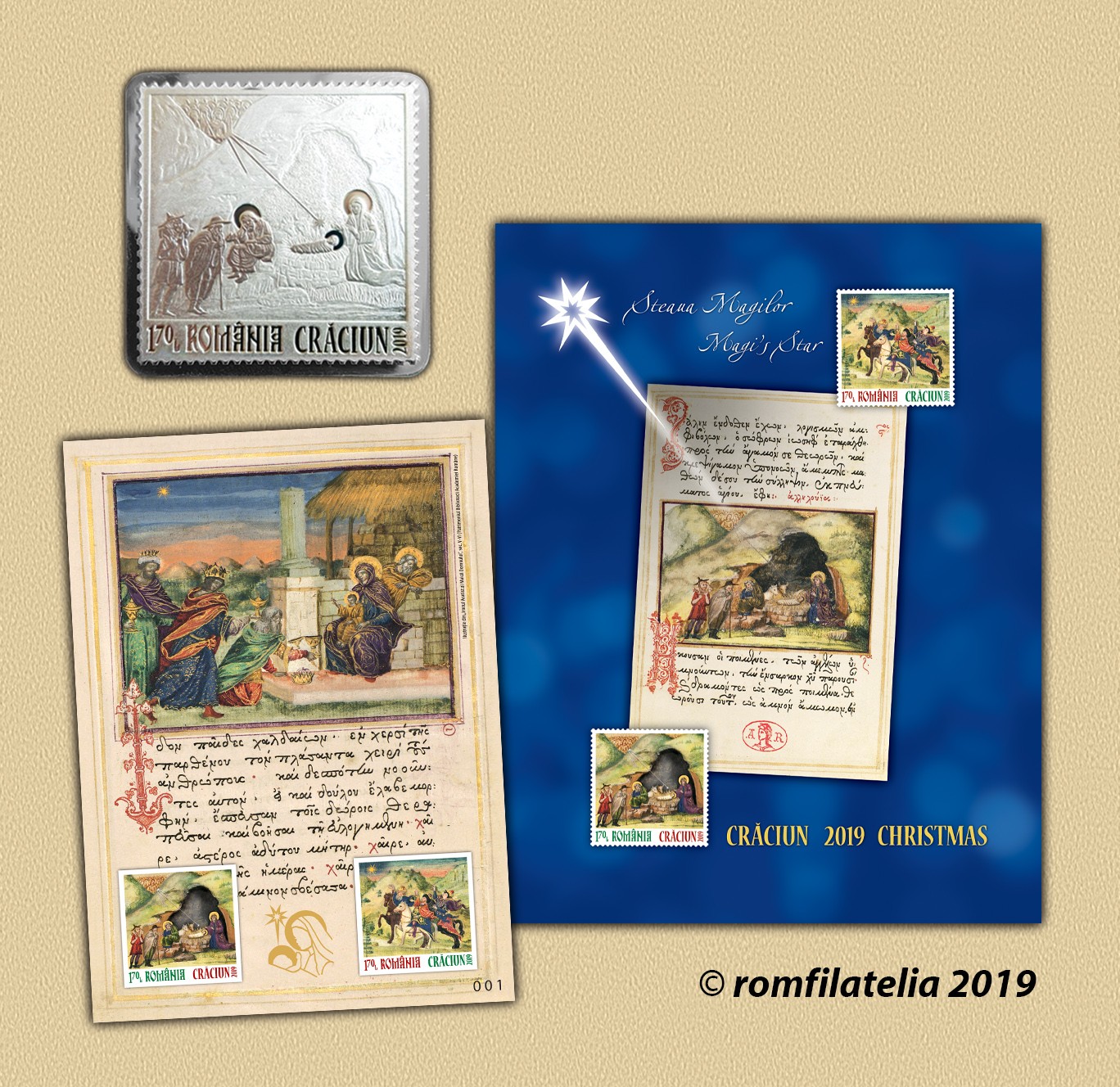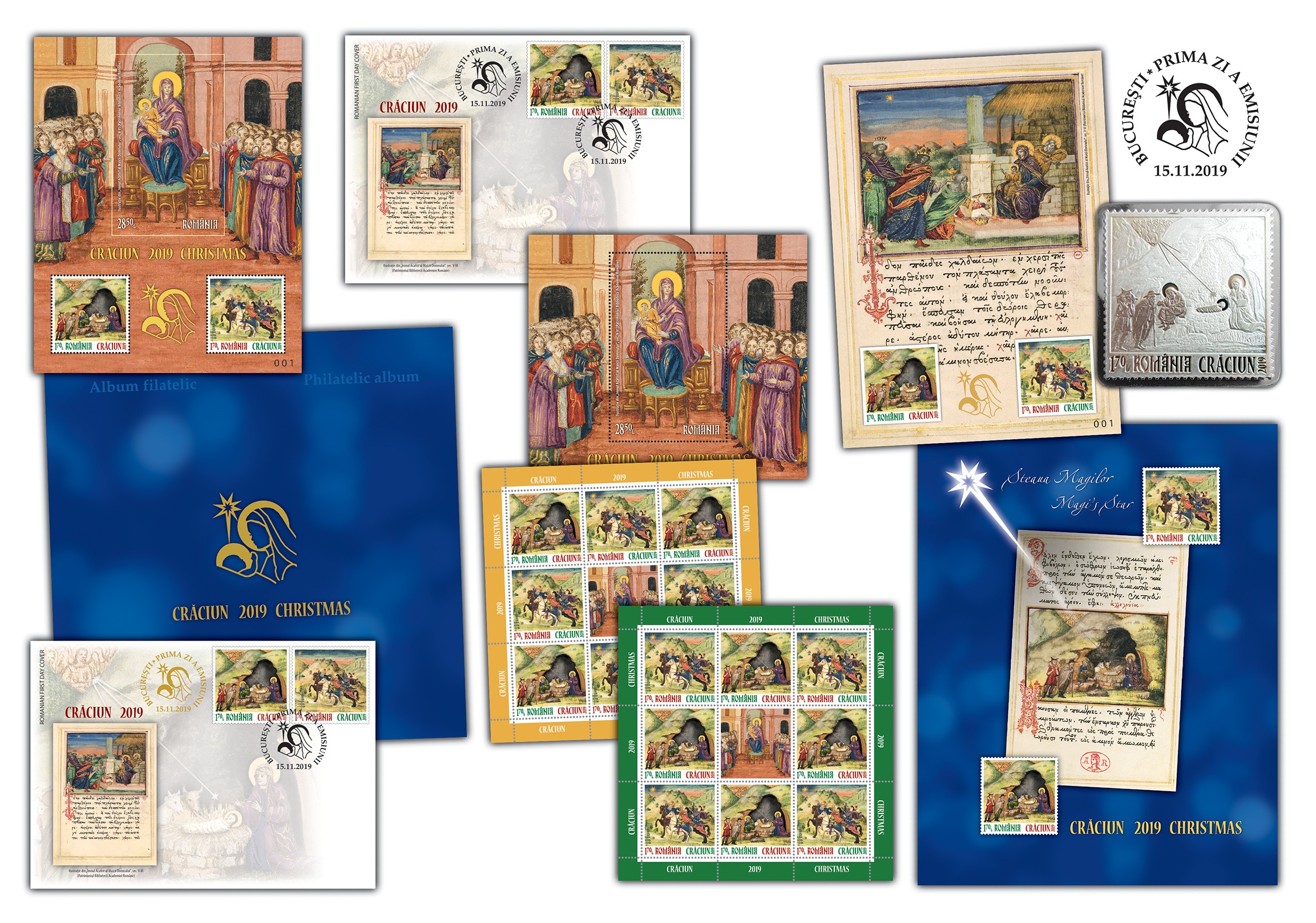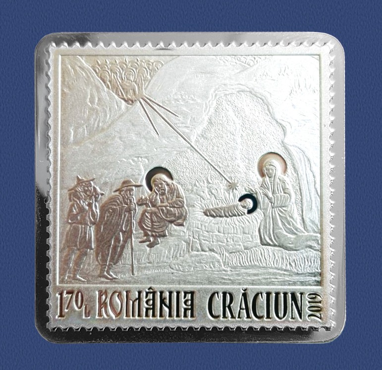 Produs special, cu timbru de argint, reunește într-o prezentare originală un bloc filatelic de colecție (conținând două timbre nedantelate), realizat în tiraj limitat de 319 exemplare, replica modelată în argint a mărcii poștale care ilustrează miniatura Nașterea Domnului și Certificatul de Autenticitate eliberat de Monetăria Statului, înseriate de la 001 la 319)