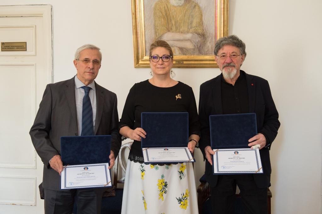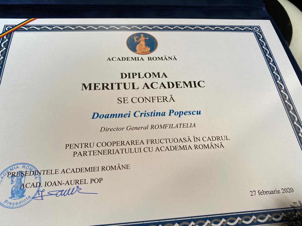 În acest cadru festiv, Președintele Academiei Române i-a conferit doamnei Cristina Popescu, Director General Romfilatelia, Diploma „Meritul Academic pentru cooperarea fructuoasă în cadrul Parteneriatului cu Academia Română”: „Îi mulțumesc doamnei Cristina Popescu pentru sprijinul pe care îl oferă Academiei Române, ori de câte ori este nevoie, prin publicarea, tipărirea acestor mărci poștale extraordinare”.