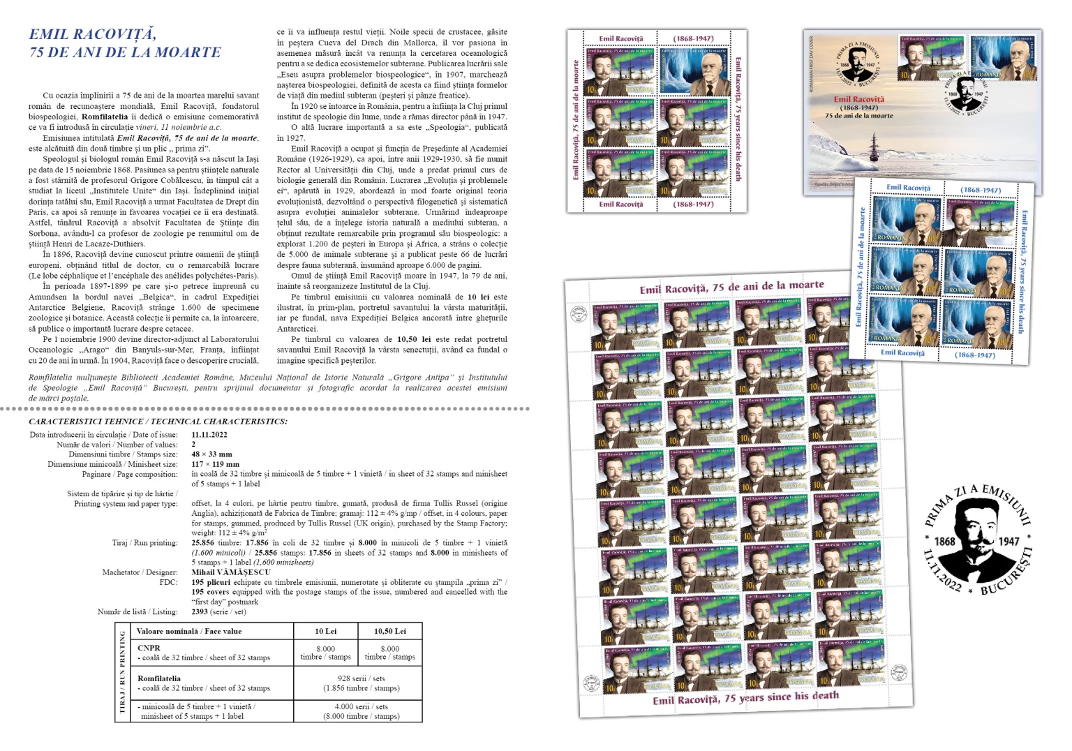 Cu ocazia împlinirii a 75 de ani de la moartea marelui savant român de recunoaştere mondială, Emil Racoviță, fondatorul biospeologiei, Romfilatelia îi dedică o emisiune comemorativă ce va fi introdusă în circulație vineri, 11 noiembrie a.c.
