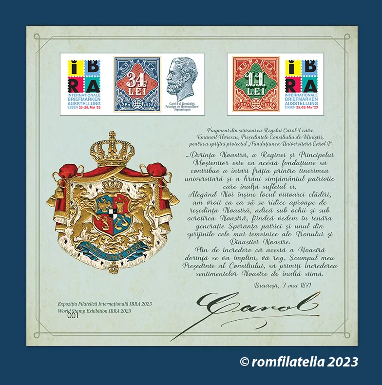 Blocul de colecție, (înseriat), cu cele două mărci poștale nedantelate, include în grafica lui stema regală a României și un fragment al textului unei scrisori adresată de Regele Carol I (la 3 mai 1891) Președintelui Consiliului de Miniștri Emanoil Florescu, în vederea obținerii unui sprijin concret privind realizarea proiectului care avea în vedere Fundația Universitară „Carol I” (cunoscută astăzi și ca Biblioteca Centrală Universitară „Carol I”). Semnătura (reprodusă) Regelui Carol I conferă produsului un caracter de noblețe oficială.