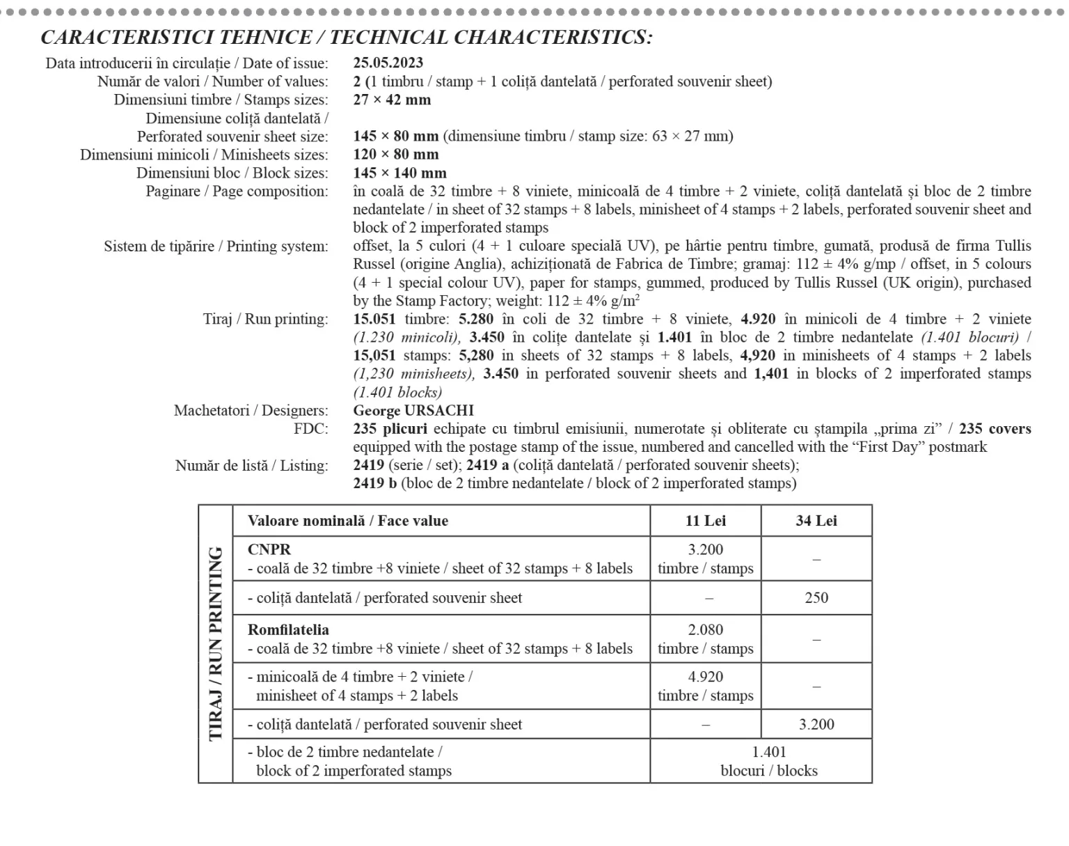 Emisiunea va fi disponibilă de Joi, 25 mai, în rețeaua magazinelor Romfilatelia din București, Bacău, Brașov, Cluj-Napoca, Iași, Timișoara, precum și în magazinul nostru online: https://romfilatelia.ro/store/.