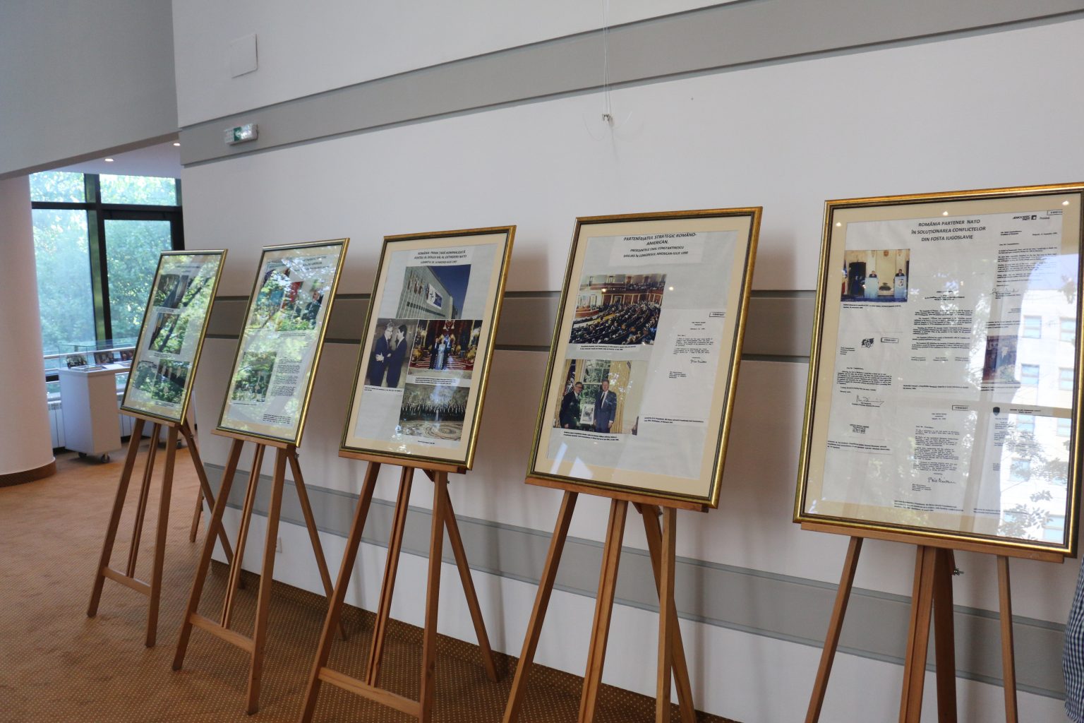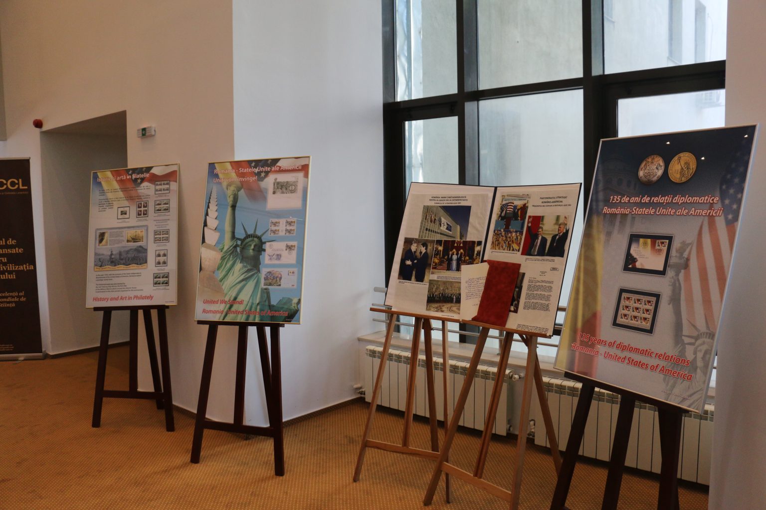 Panourile filatelice prezentate cu emisiuni de marci postale cu emisiuni de mărci poştale emise în perioada 1939-2015, cu tematici dedicate relaților diplomatice și parteneriatului strategic dintre România și SUA, s-au armonizat cu expoziția de fotografii și documente personale ale domnului Emil Constantinescu.