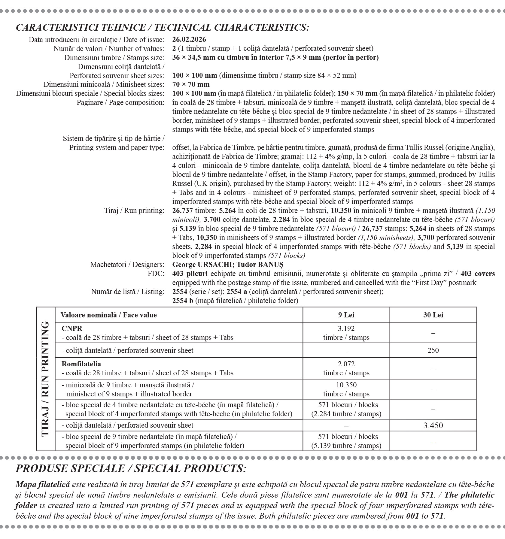 Romfilatelia mulțumește reprezentanților Federației Filatelice Române, ai Federației Internaționale de Filatelie, ai Muzeului Recordurilor Românești și ai Fabricii de Timbre, Sucursala Poștei Române, pentru sprijinul documentar și colaborarea la realizarea acestei emisiuni de mărci poștale.