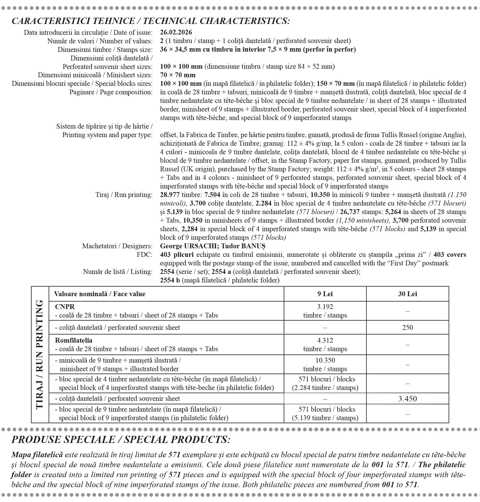Romfilatelia mulțumește reprezentanților Federației Filatelice Române, ai Federației Internaționale de Filatelie, ai Muzeului Recordurilor Românești și ai Fabricii de Timbre, Sucursala Poștei Române, pentru sprijinul documentar și colaborarea la realizarea acestei emisiuni de mărci poștale.