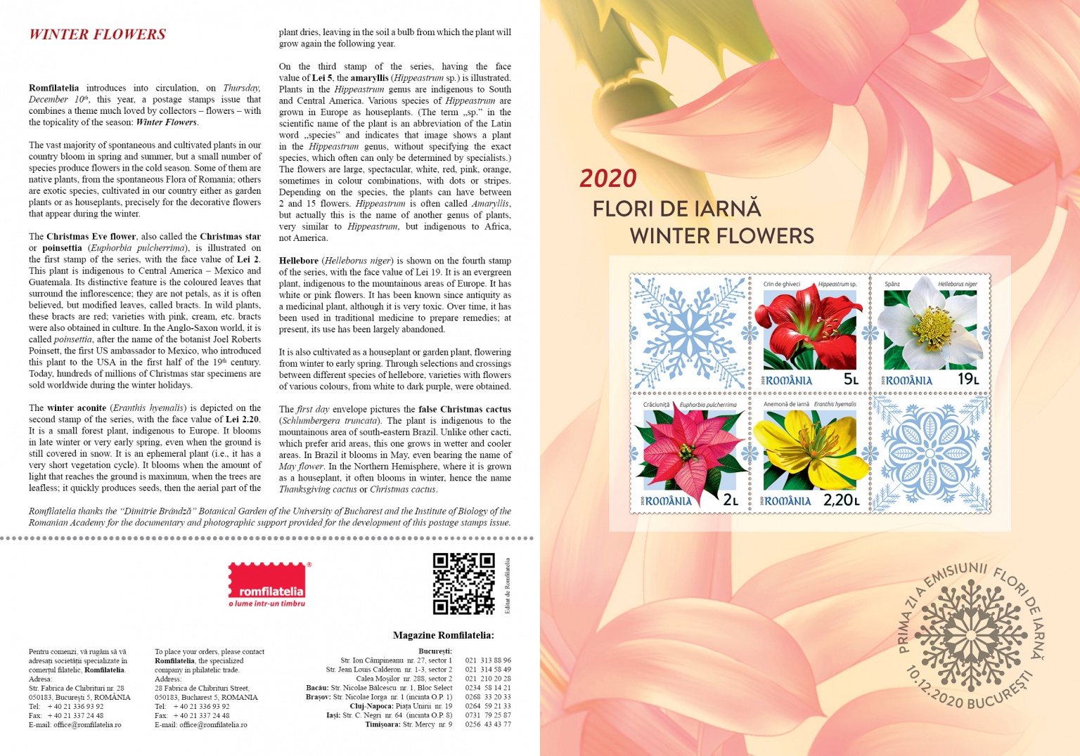 Emisiunea de mărci poștale „Flori de iarnă” va fi disponibilă începând de joi, 10 decembrie 2020, în magazinele Romfilatelia din București, Bacău, Brașov, Cluj-Napoca, Iași, Timișoara, precum și în magazinul nostru online: https://romfilatelia.ro/store/. Aceasta este completată de plicul „prima zi”, coala de 28 timbre și minicoala de 5 timbre + 1 vinietă.